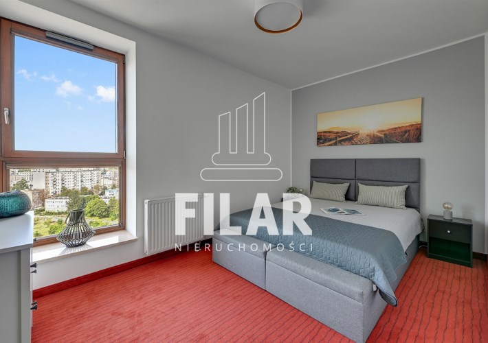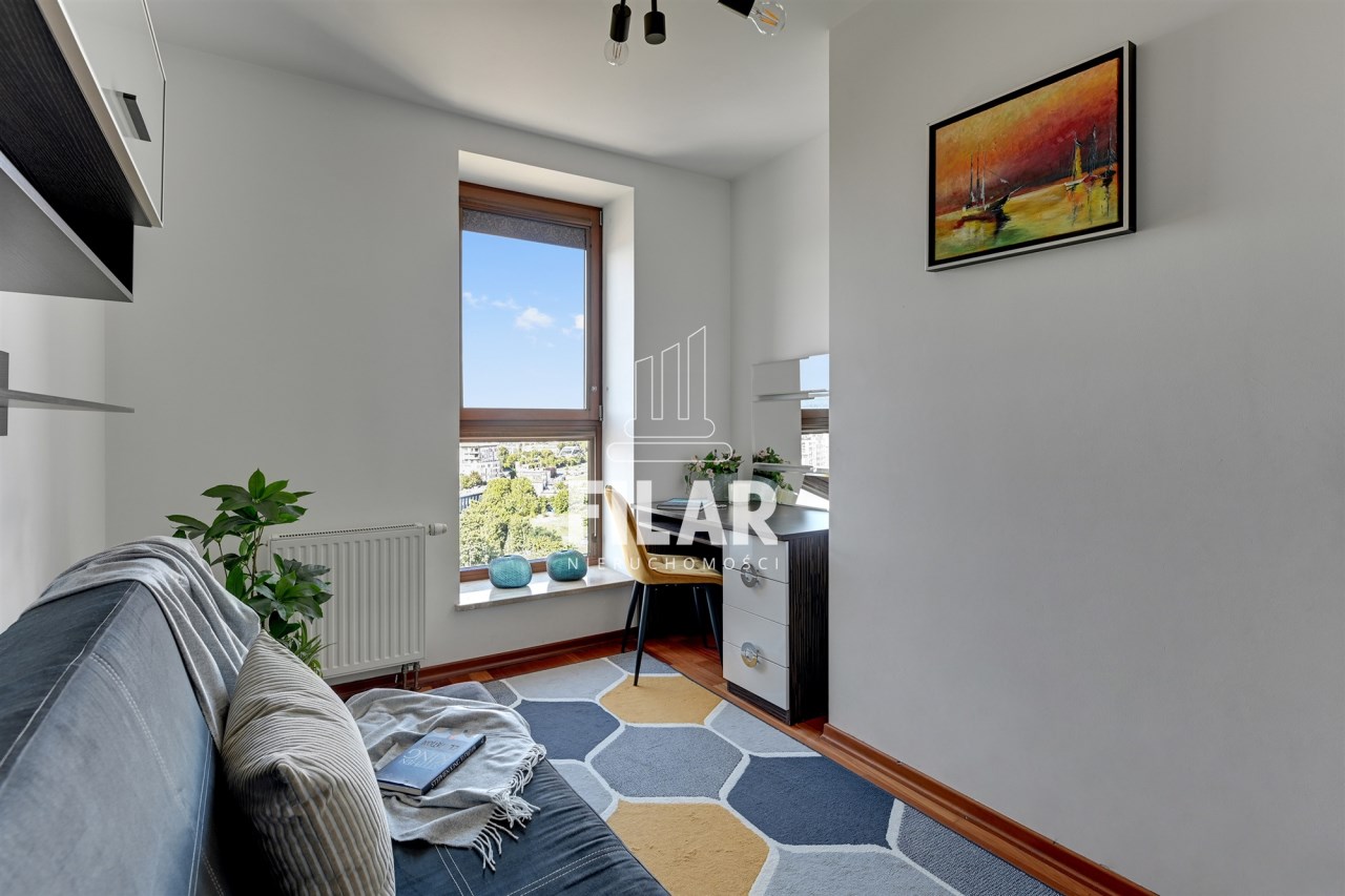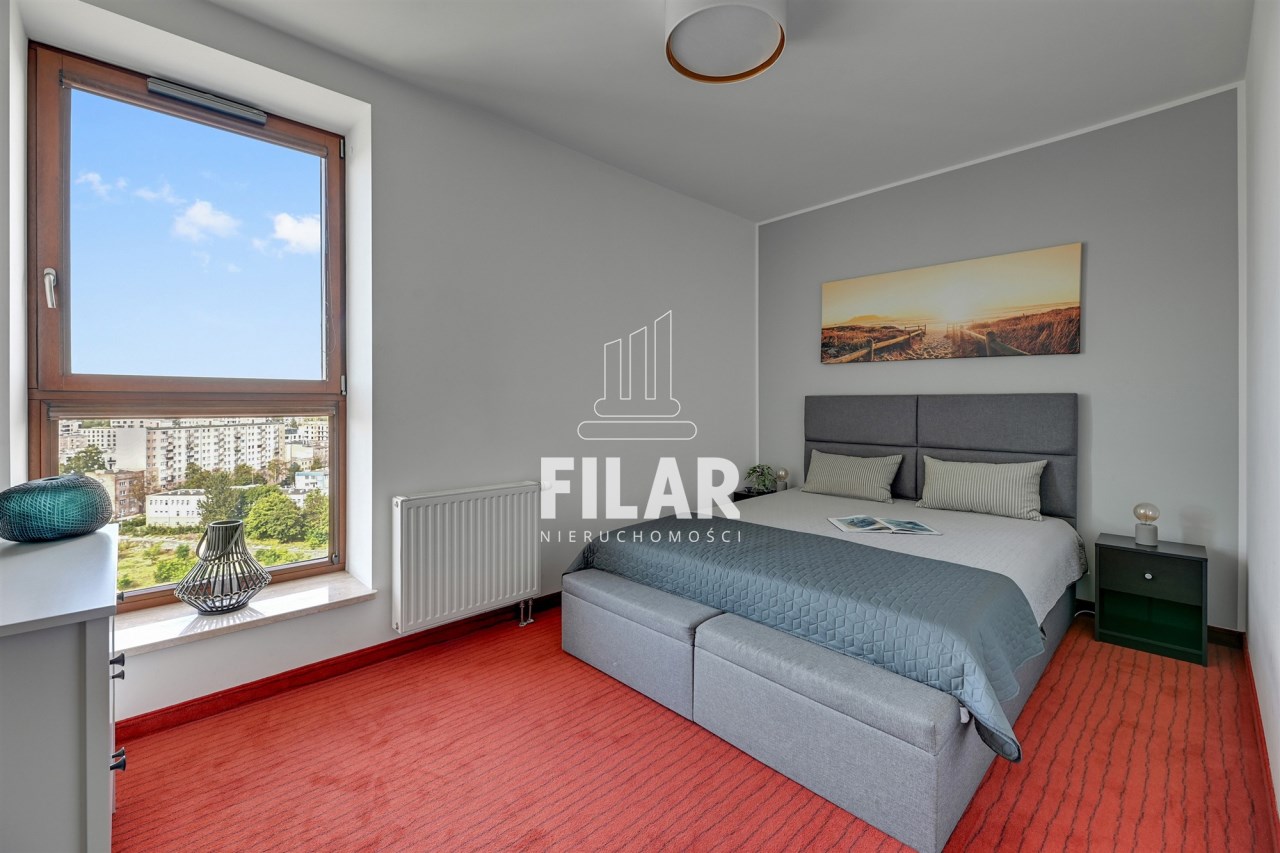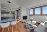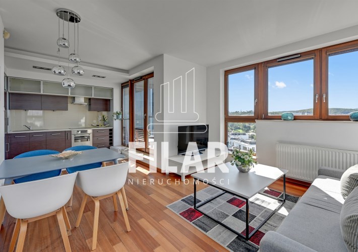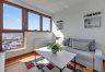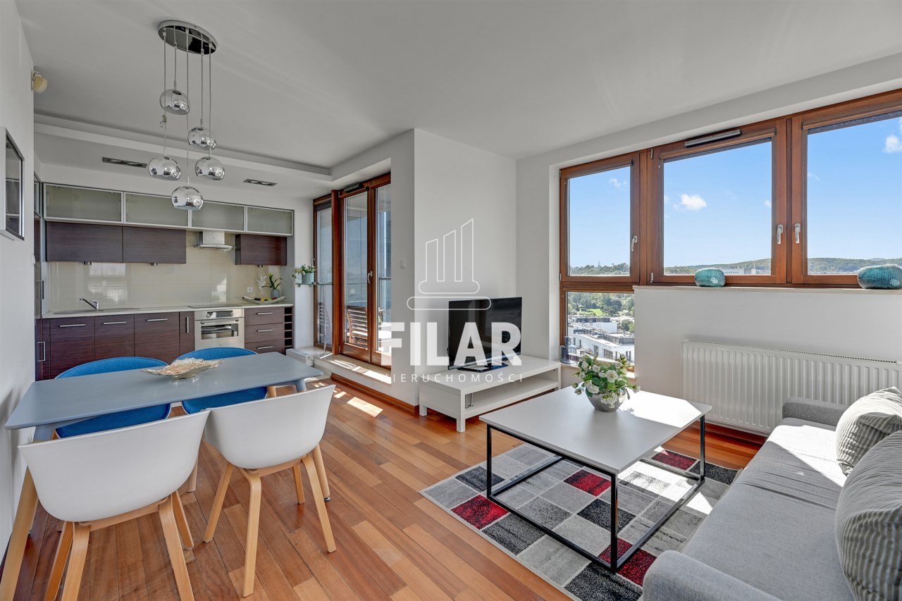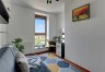 A three-room apartment located on the 12th floor with a view of the city and the port. The apartment comprises a living room with a kitchenette, two bedrooms, a bathroom and a toilet. The living room is connected with the dining room and kitchen. The main bedroom has a double bed and a TV, while the second bedroom has a fold-out sofa, built-in wardrobe and a place to work. The bathroom has a bathtub and a washing machine. The apartment is fully equipped with all necessary appliances.