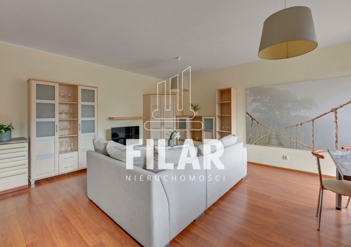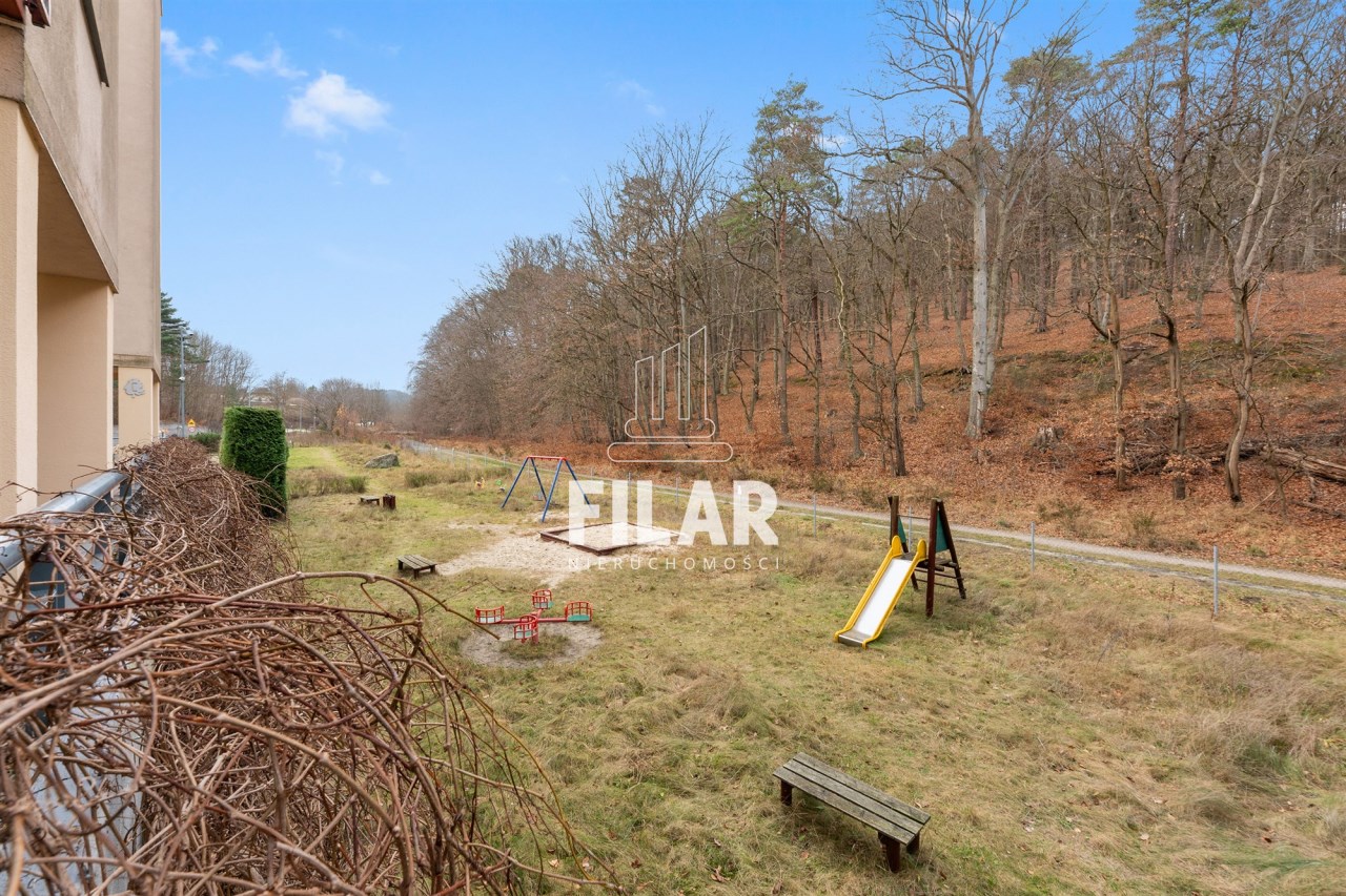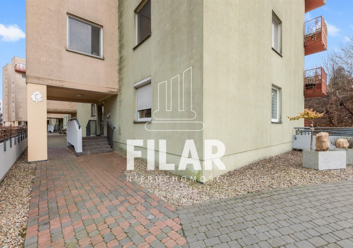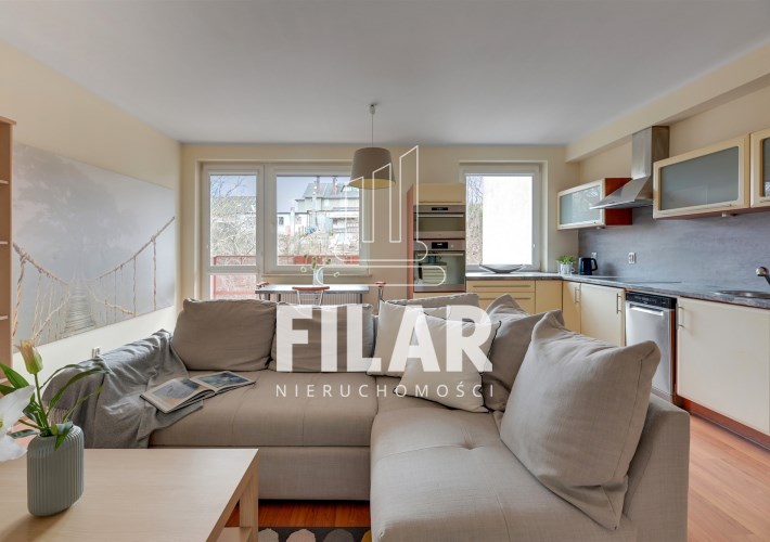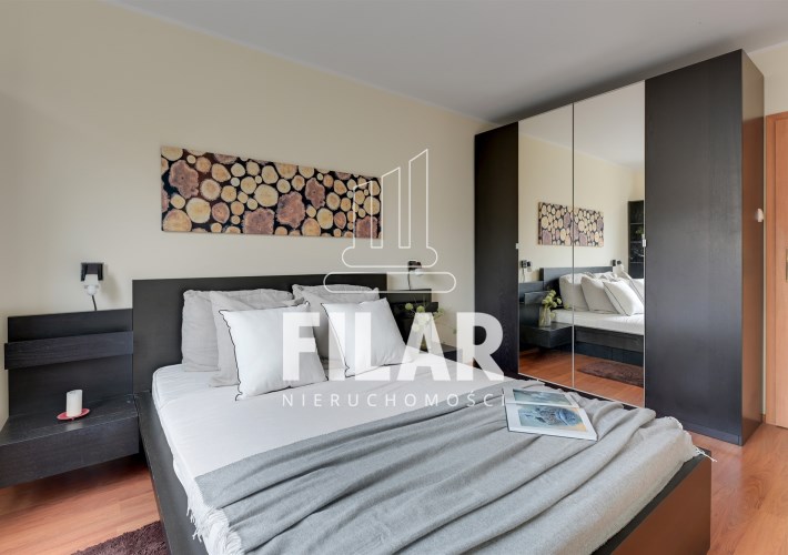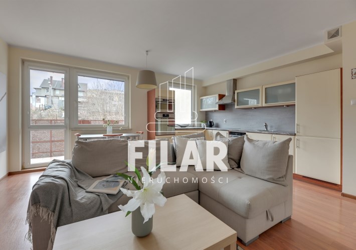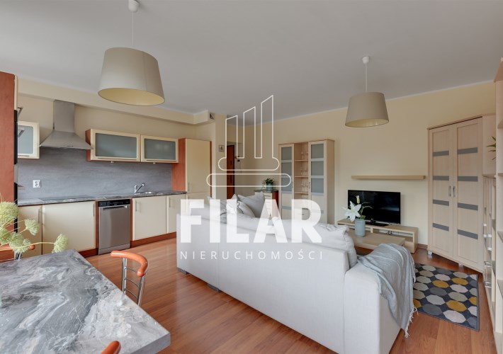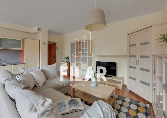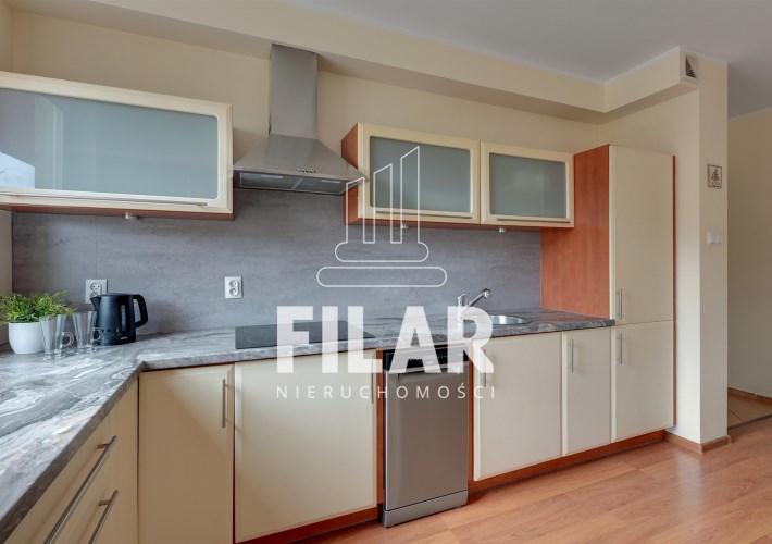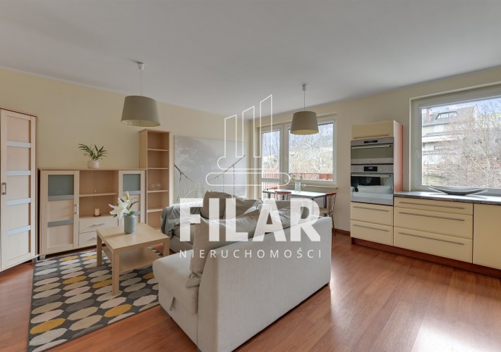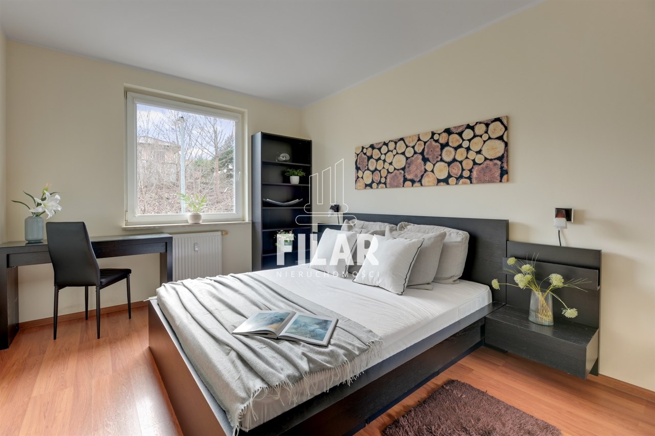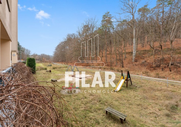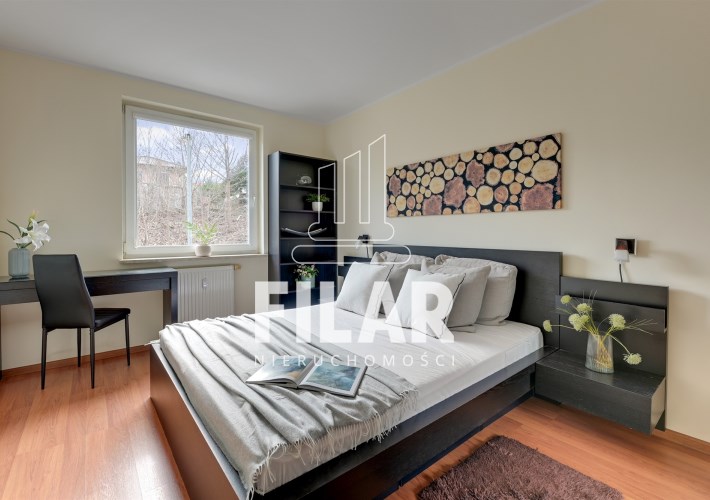Lokal mieszkalny znajduje się na pierwszym piętrze, a swoją powierzchnią 51 m2 obejmuje: salon z aneksem kuchennym, sypialnie, łazienkę z toaletą. Aneks kuchenny w pełnej zabudowie wraz ze sprzętem AGD: lodówka, zmywarka, płyta grzewcza, mikrofalówka, piekarnik oraz okap. Salon z wyjściem na balkon, od strony południowej z widokiem za zieloną ścianę Parku Krajobrazowego, sypialnia z dużym dwuosobowym łóżkiem urządzona w ciepłych odcieniach brązu i beżu. Funkcjonalne zabudowy obejmujące szafy, regały, komody i szafki znajdują się w każdym pomieszczeniu. Łazienka z wygodną wanną, toaletą, pralką i szafkami. Mieszkanie jest komfortowe, ustawne, ciche i bardzo słoneczne, dzięki wystawie południowej.