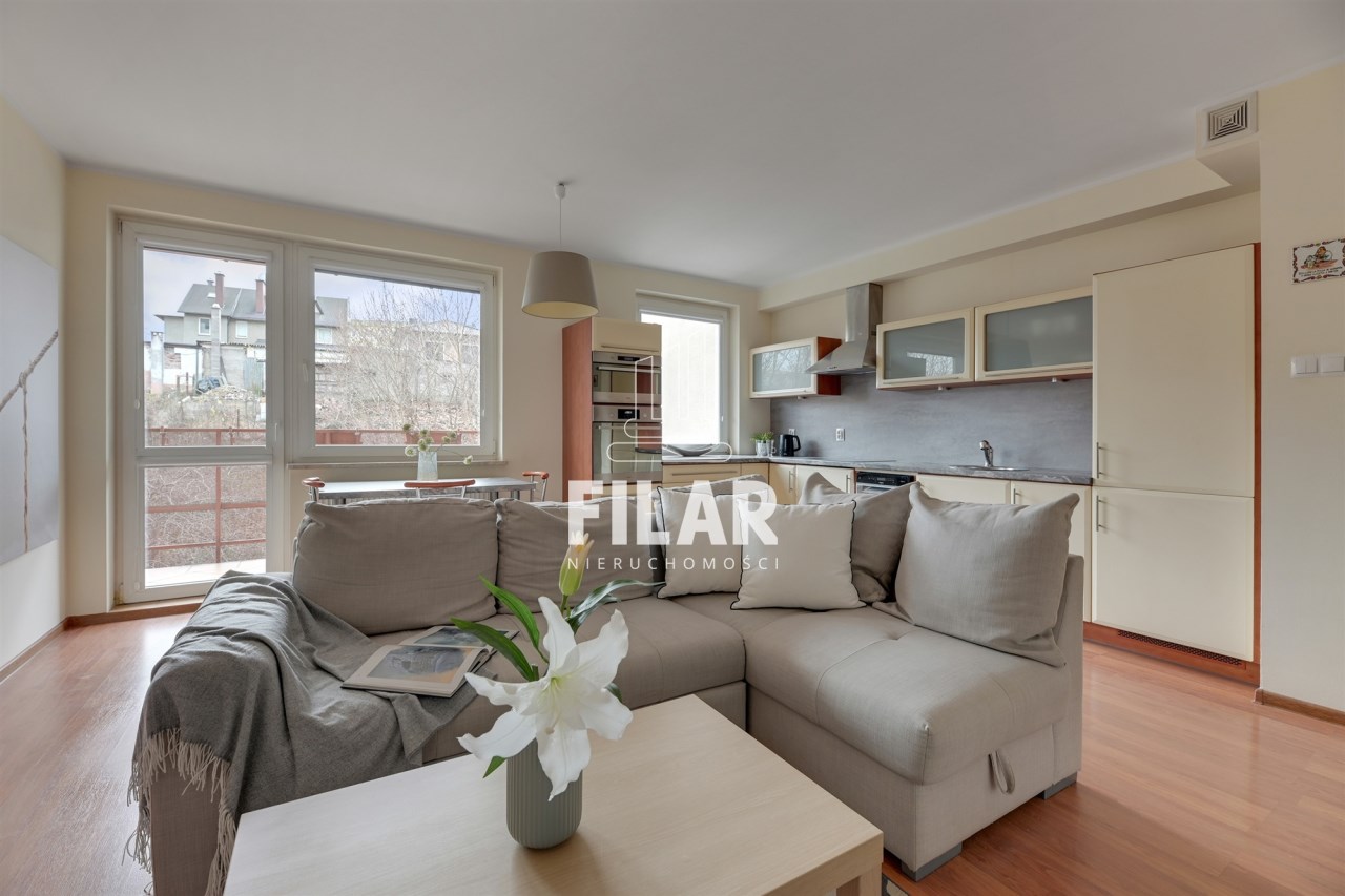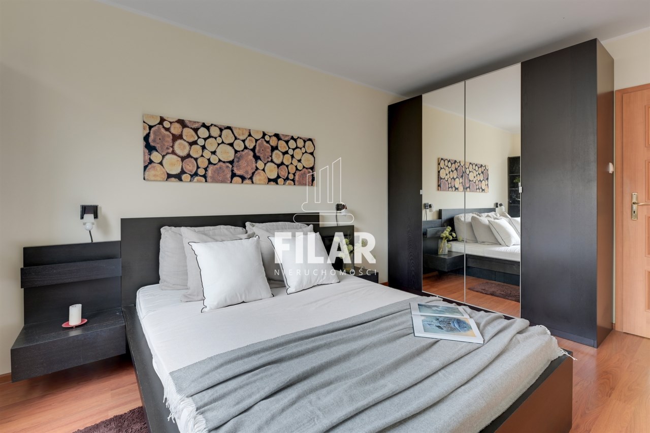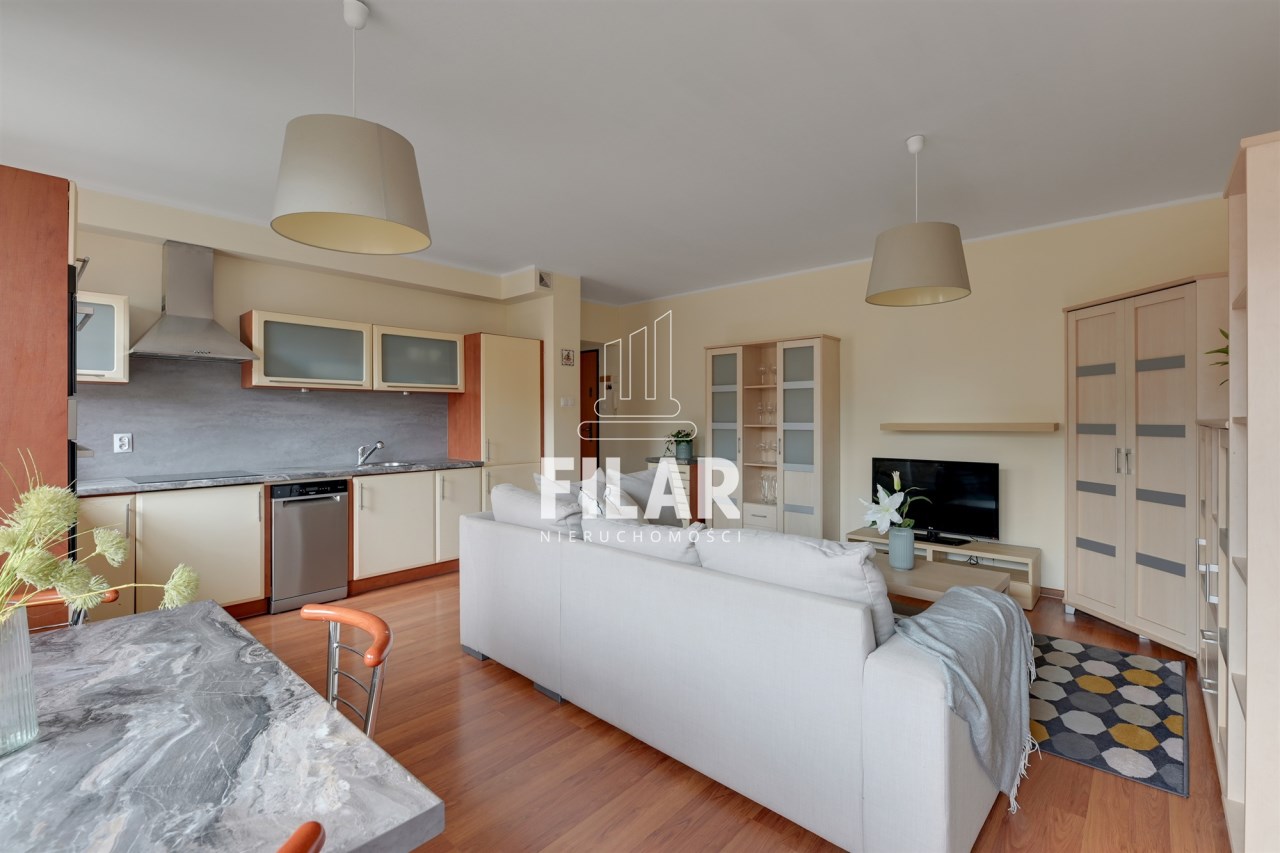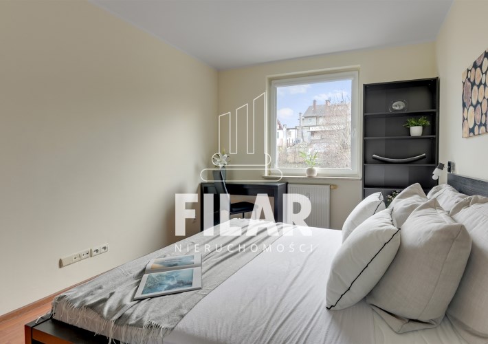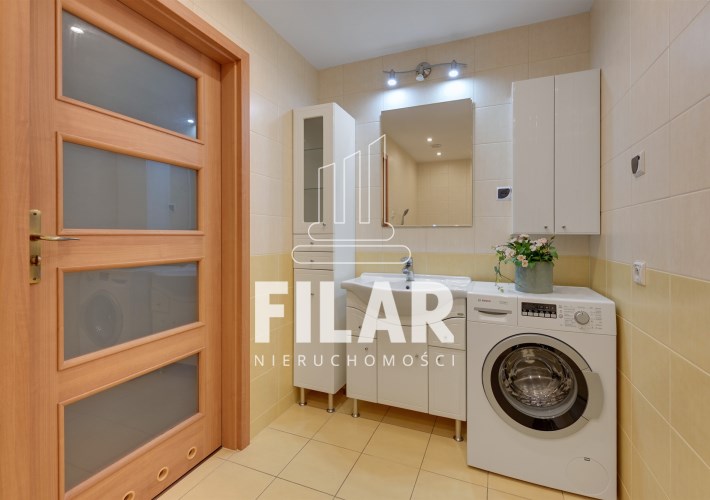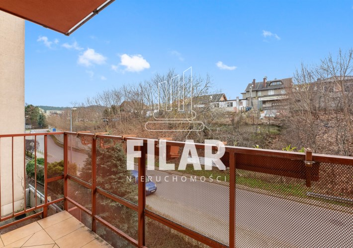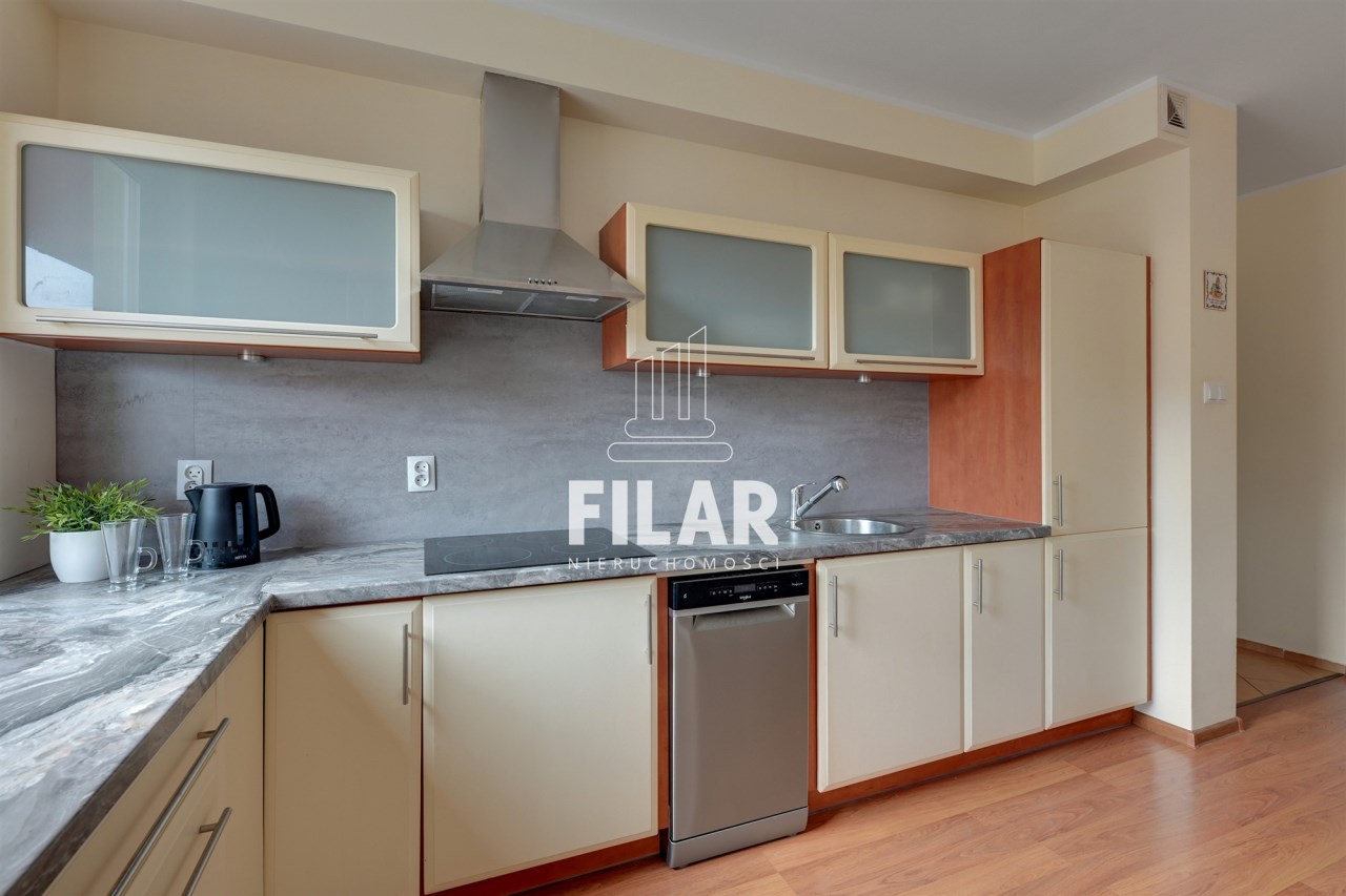 Lokal mieszkalny znajduje się na pierwszym piętrze, a swoją powierzchnią 51 m2 obejmuje: salon z aneksem kuchennym, sypialnie, łazienkę z toaletą. Aneks kuchenny w pełnej zabudowie wraz ze sprzętem AGD: lodówka, zmywarka, płyta grzewcza, mikrofalówka, piekarnik oraz okap. Salon z wyjściem na balkon, od strony południowej z widokiem za zieloną ścianę Parku Krajobrazowego, sypialnia z dużym dwuosobowym łóżkiem urządzona w ciepłych odcieniach brązu i beżu. Funkcjonalne zabudowy obejmujące szafy, regały, komody i szafki znajdują się w każdym pomieszczeniu. Łazienka z wygodną wanną, toaletą, pralką i szafkami. Mieszkanie jest komfortowe, ustawne, ciche i bardzo słoneczne, dzięki wystawie południowej.