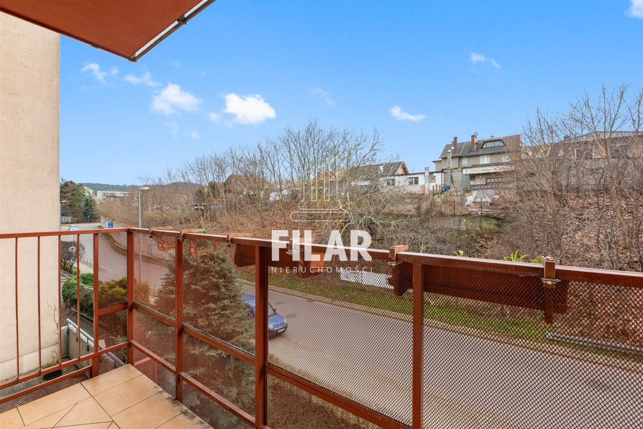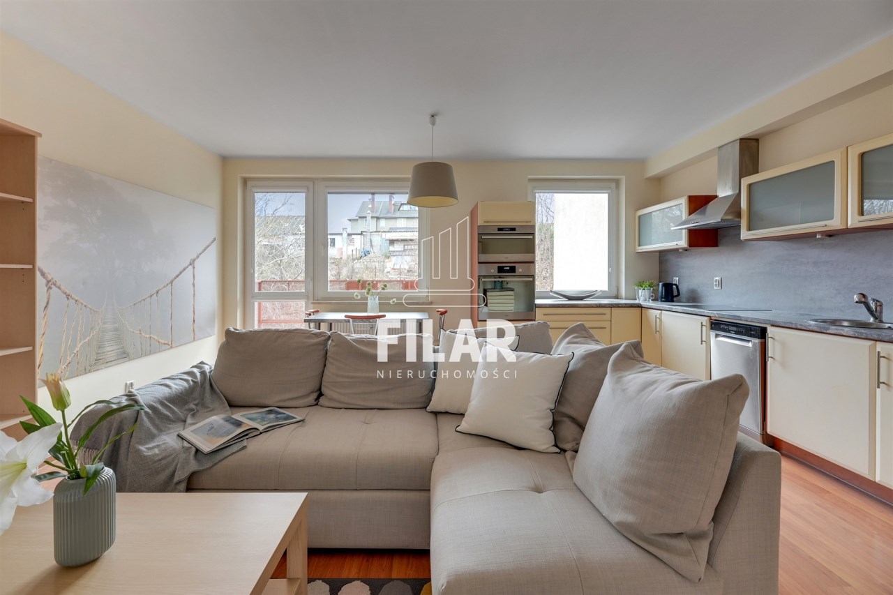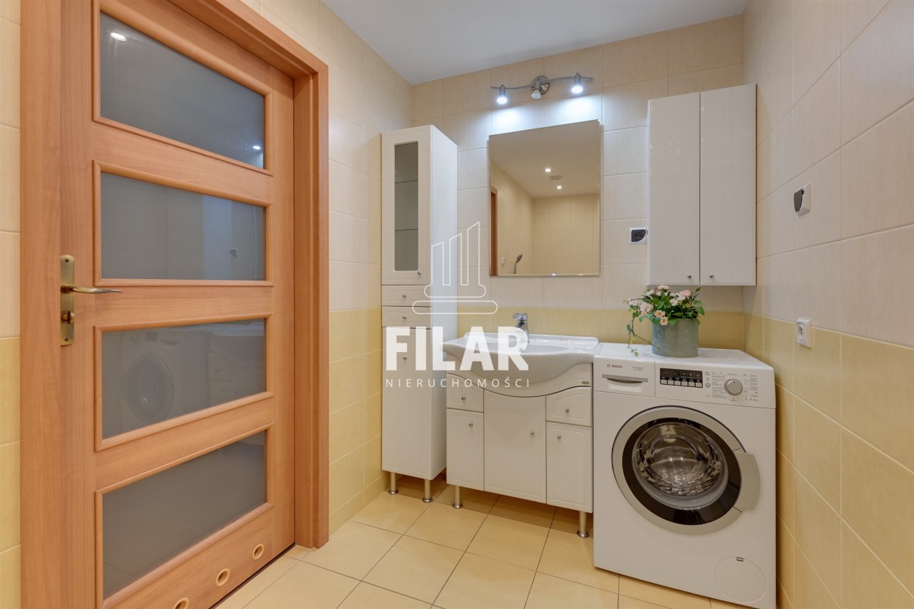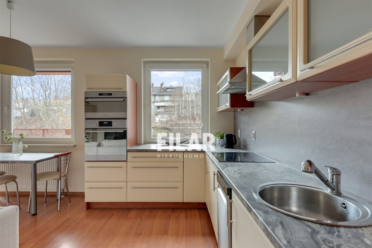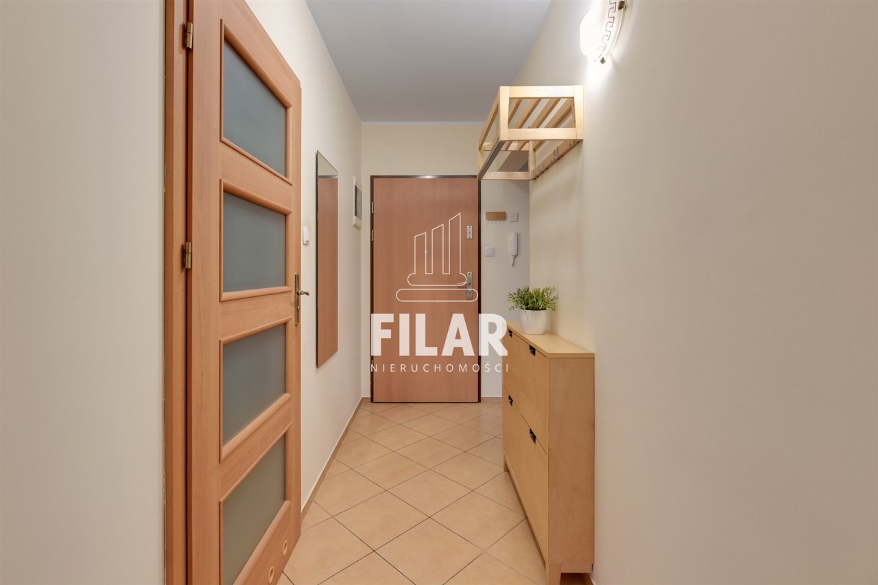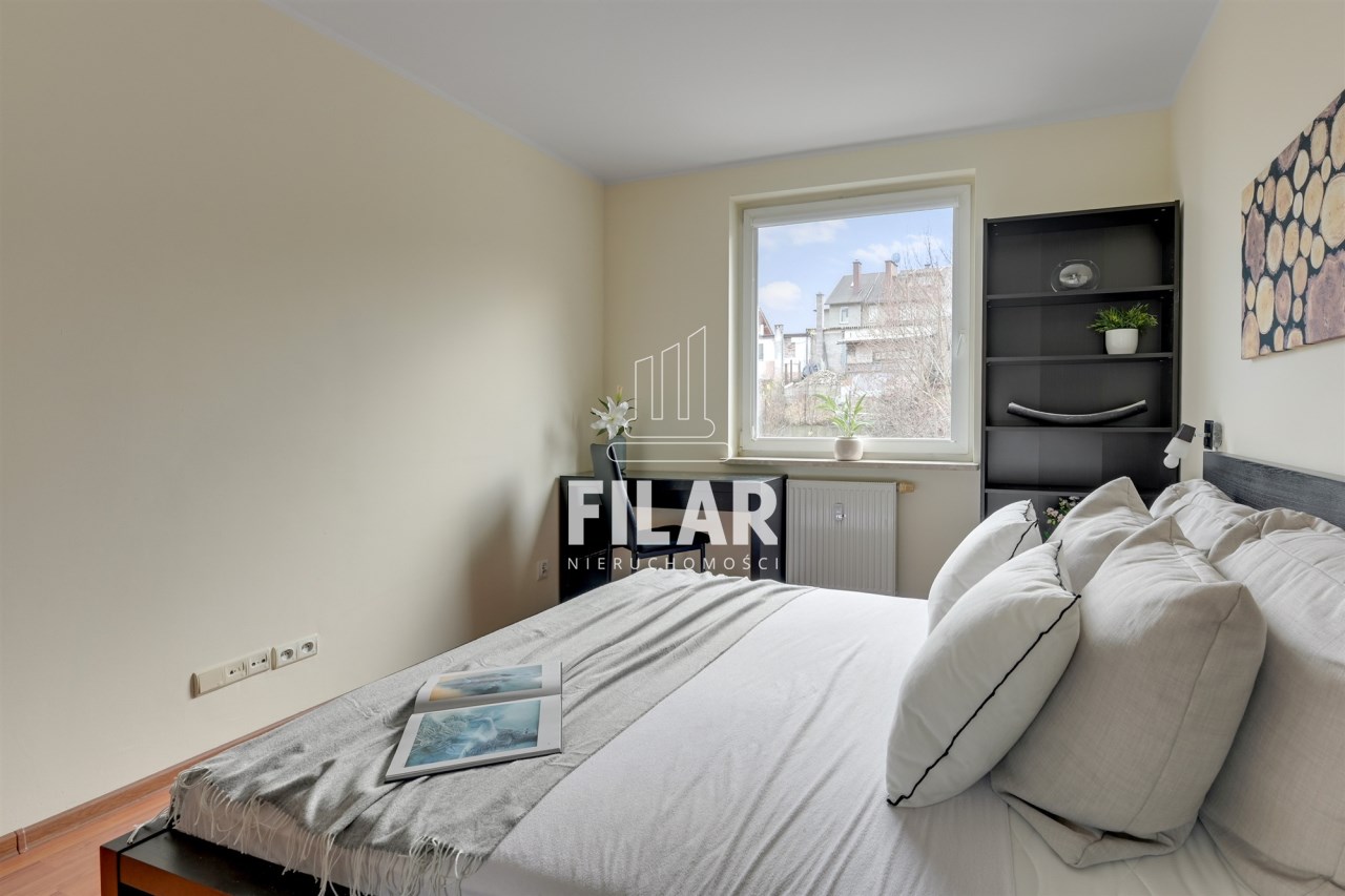 Lokal mieszkalny znajduje się na pierwszym piętrze, a swoją powierzchnią 51 m2 obejmuje: salon z aneksem kuchennym, sypialnie, łazienkę z toaletą. Aneks kuchenny w pełnej zabudowie wraz ze sprzętem AGD: lodówka, zmywarka, płyta grzewcza, mikrofalówka, piekarnik oraz okap. Salon z wyjściem na balkon, od strony południowej z widokiem za zieloną ścianę Parku Krajobrazowego, sypialnia z dużym dwuosobowym łóżkiem urządzona w ciepłych odcieniach brązu i beżu. Funkcjonalne zabudowy obejmujące szafy, regały, komody i szafki znajdują się w każdym pomieszczeniu. Łazienka z wygodną wanną, toaletą, pralką i szafkami. Mieszkanie jest komfortowe, ustawne, ciche i bardzo słoneczne, dzięki wystawie południowej.