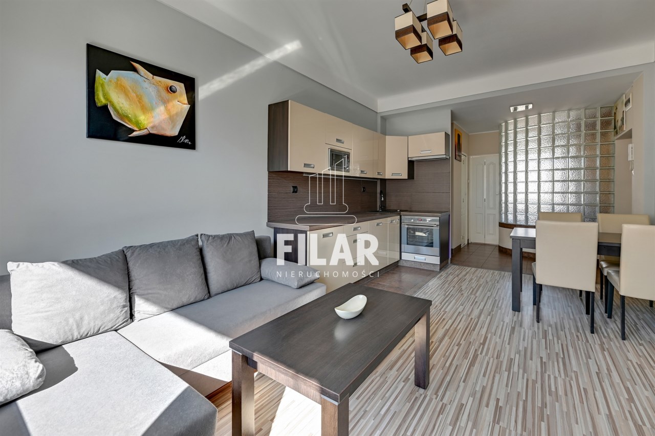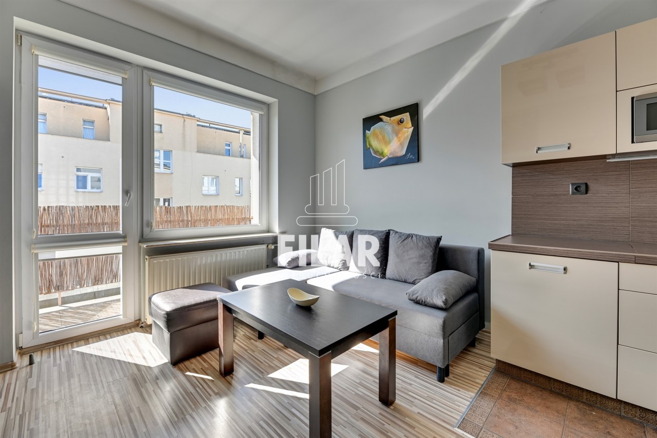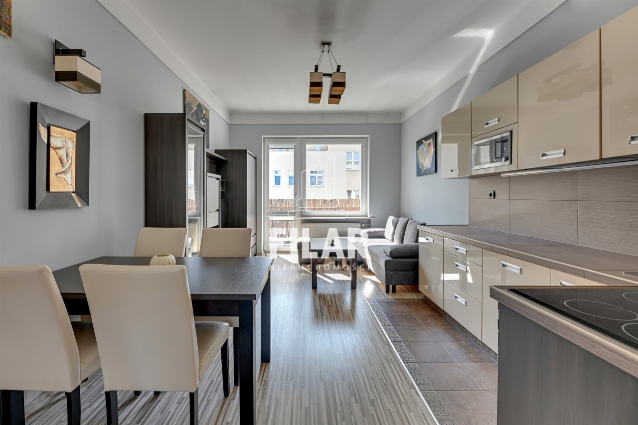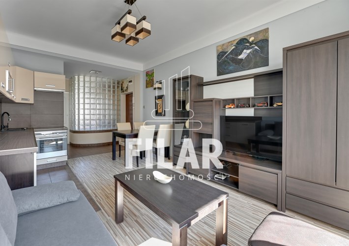 The apartment of 33 m2 consists of a spacious living room with a kitchenette, a comfortable bedroom, a bright, neatly decorated bathroom and a large balcony. Its interior is maintained in pastel, subdued colors, which create a cozy and harmonious space. The living room is equipped with a stylish furniture set, a corner sofa with a sleeping function, a coffee table, a dining table and a TV, making it an ideal place for both relaxation and socializing. The kitchenette is equipped with essential appliances, including a large refrigerator-freezer, induction hob, oven, dishwasher and microwave, as well as full kitchen facilities. The cozy bedroom offers a comfortable 160 cm wide bed and a roomy wardrobe closet, providing plenty of storage space. The elegant bathroom has both a corner bathtub and a shower, as well as a washing machine for your convenience. The entire interior has been thoughtfully and aesthetically designed, making the apartment an ideal place to live.