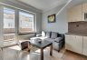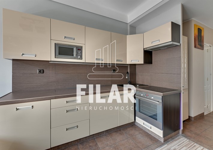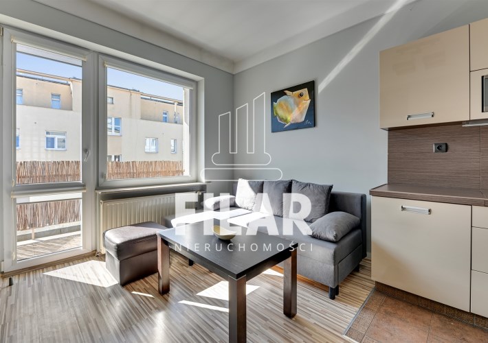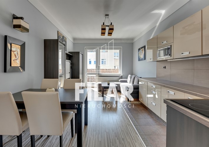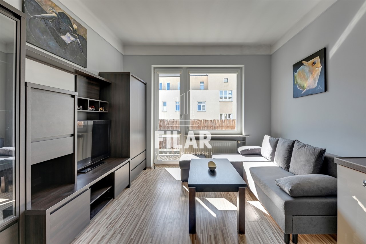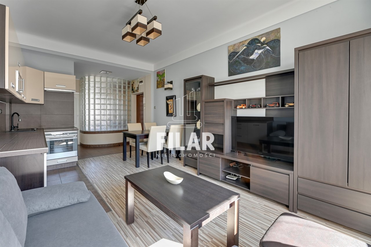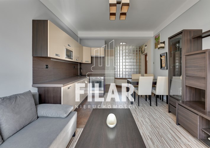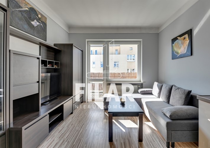 The apartment of 33 m2 consists of a spacious living room with a kitchenette, a comfortable bedroom, a bright, neatly decorated bathroom and a large balcony. Its interior is maintained in pastel, subdued colors, which create a cozy and harmonious space. The living room is equipped with a stylish furniture set, a corner sofa with a sleeping function, a coffee table, a dining table and a TV, making it an ideal place for both relaxation and socializing. The kitchenette is equipped with essential appliances, including a large refrigerator-freezer, induction hob, oven, dishwasher and microwave, as well as full kitchen facilities. The cozy bedroom offers a comfortable 160 cm wide bed and a roomy wardrobe closet, providing plenty of storage space. The elegant bathroom has both a corner bathtub and a shower, as well as a washing machine for your convenience. The entire interior has been thoughtfully and aesthetically designed, making the apartment an ideal place to live.