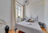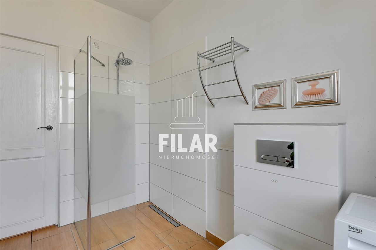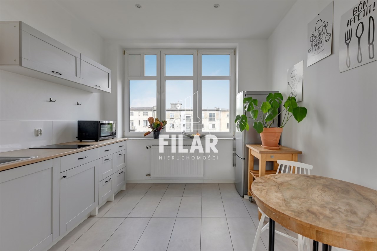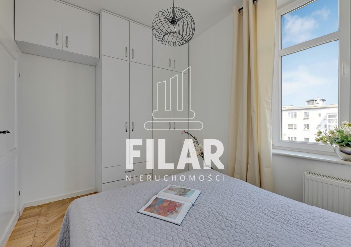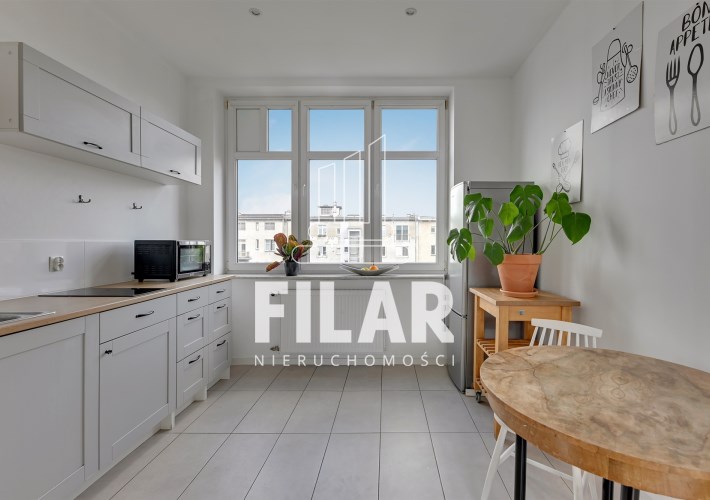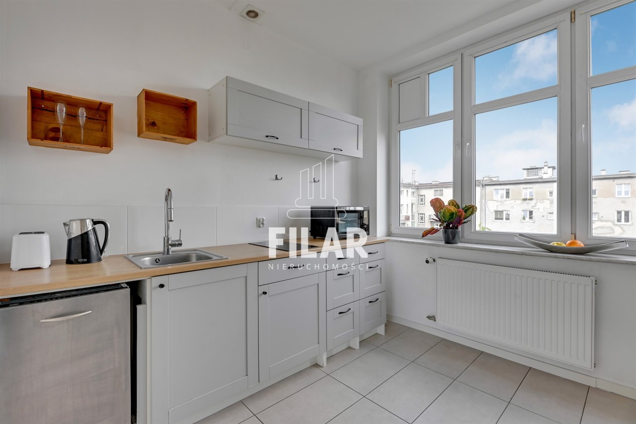 The property is located on the 4th floor and with its area of 50 m2 includes: living room, kitchen, bedroom, bathroom with toilet and hallway. The flat has been arranged in universal white with elements of light wood. The premises are fully furnished. The living room provides a seating set with a TV and a dining area with a round, comfortable table. The kitchen is equipped with a practical, corresponding with the rest of the flat furniture and necessary household appliances. From the living room there is access to a large, comfortable terrace. The bedroom offers a double bed with a comfortable mattress and two bedside tables. The bathroom consists of a shower cubicle, a toilet and a washbasin. The flat is cosy, warm and ready to move in.