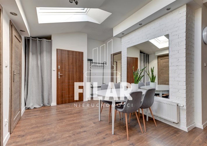 Nieruchomość o powierzchni 80 m2 znajduje się na 2 (ostatnim) piętrze i obejmuje salon, jadalnię z aneksem kuchennym, sypialnię, łazienkę i dwie garderoby. Stylowe mieszkanie na poddaszu, nawiązujące do estetyki loft oferuje nietuzinkowe rozwiązania, przy jednoczesnym zachowaniu sporej przestrzeni. Jadalnię oraz aneks kuchenny wyposażono w stół z czterema krzesłami w komplecie oraz pełne umeblowanie kuchni wraz z niezbędnym sprzętem AGD. Sąsiaduje z nim pokój dzienny, rekreacyjny wyposażony w sofę i stolik kawowy. Może on także posłużyć za funkcjonalny gabinet. Sypialnię stanowi spore łóżko, komoda oraz trzydrzwiowa szafa. Dzięki zastosowanych wewnątrz przeszkleń, apartament jest jasny i przestronny, a surowe stropowe belki dodają mieszkaniu uroku. Dodatkowo do dyspozycji najemcy są dwie garderoby. Stonowaną kolorystycznie łazienkę wyposażono w kabinę prysznicową, toaletę, umywalkę oraz pralkę. Mieszkanie posłuży jako wygodne, przestronne lokum w świetnej lokalizacji, tuż przy śródmiejskim sercu Gdyni.