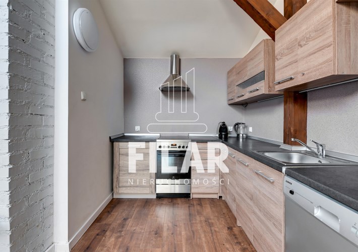The property of 80 m2 is located on the 2nd (top) floor and comprises a living room, dining room with kitchenette, bedroom, bathroom and two dressing rooms. The stylish loft flat, reminiscent of the loft aesthetic, offers unfussy solutions while retaining ample space. The dining room and kitchenette are equipped with a table with four chairs included and full kitchen furniture with all necessary appliances. Adjacent to it is a living, recreational room equipped with a sofa and coffee table. It can also serve as a functional study. The bedroom has a large bed, a chest of drawers and a three-door wardrobe. Thanks to the glazing used inside, the flat is bright and spacious, and the raw ceiling beams add to the charm of the flat. In addition, there are two wardrobes at the tenant's disposal. The colourfully toned bathroom is equipped with a shower cubicle, toilet, washbasin and washing machine. The flat will serve as a comfortable, spacious dwelling in a great location, right in the downtown heart of Gdynia.
