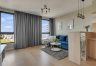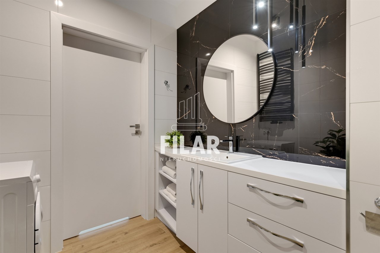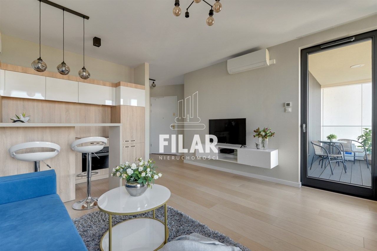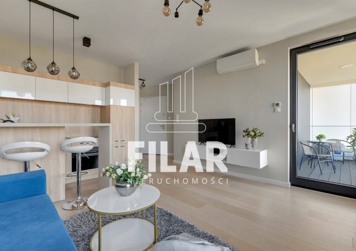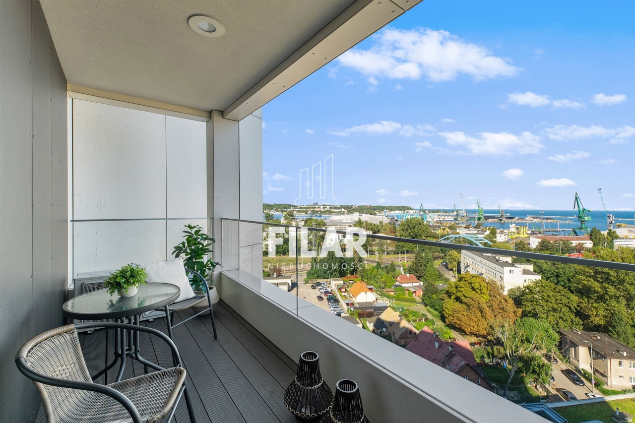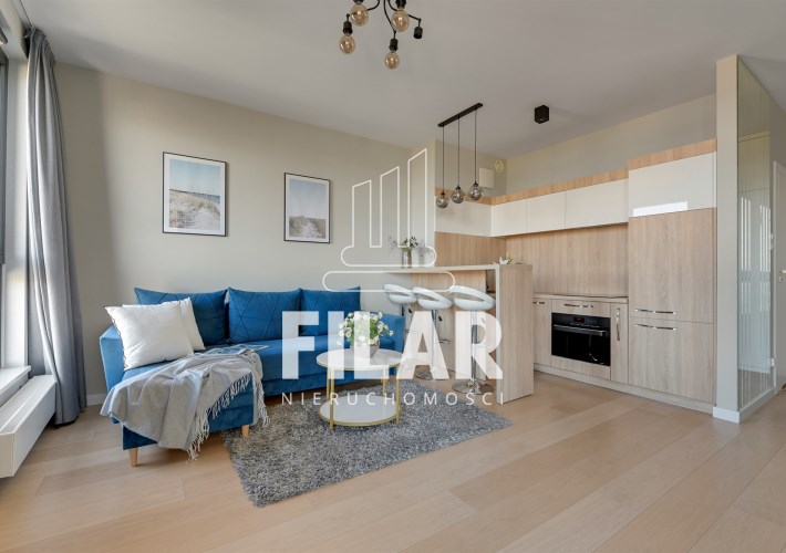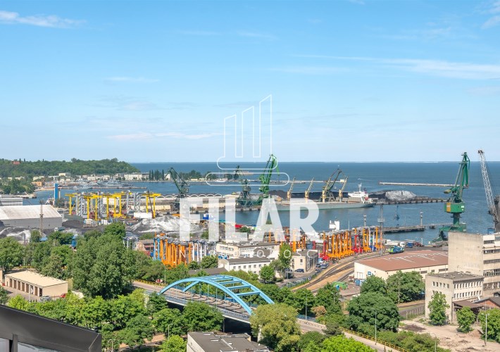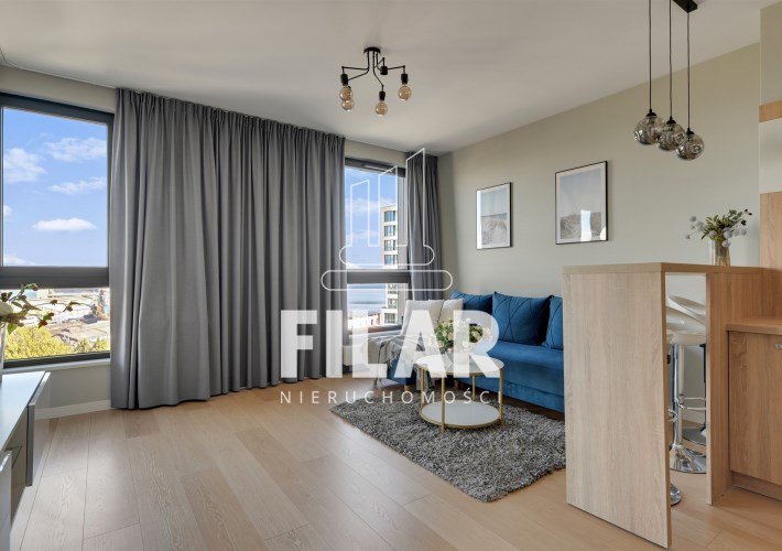 A modern apartment with an area of 41 m2, located on the 10th floor of a newly built building. The apartment consists of a spacious living room with a kitchenette, a bedroom, a bathroom and a hall. In a clearly separated relaxation area there is a comfortable corner sofa and a coffee table, on the opposite side there is a media wall with a TV and a TV cabinet. Thanks to large-format windows, the living room windows offer a beautiful view of the sea and the city panorama, there is a direct exit to a large terrace, from which you can also admire the charms of the sea landscape. A kitchen area with a built-in kitchenette and an island, equipped with modern household appliances: fridge-freezer, oven, induction hob, hood, cabinet fronts in wood color with a touch of white. The bedroom has a double bed with a headboard, bedside tables and a chest of drawers. The bright tiles dominating in the bathroom have been broken for contrast with black, the whole looks very stylish, there is a shower, toilet, sink and washing machine. The entire apartment has been decorated according to the prevailing trends and finished with the highest quality materials with attention to the smallest details.