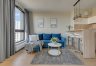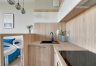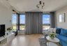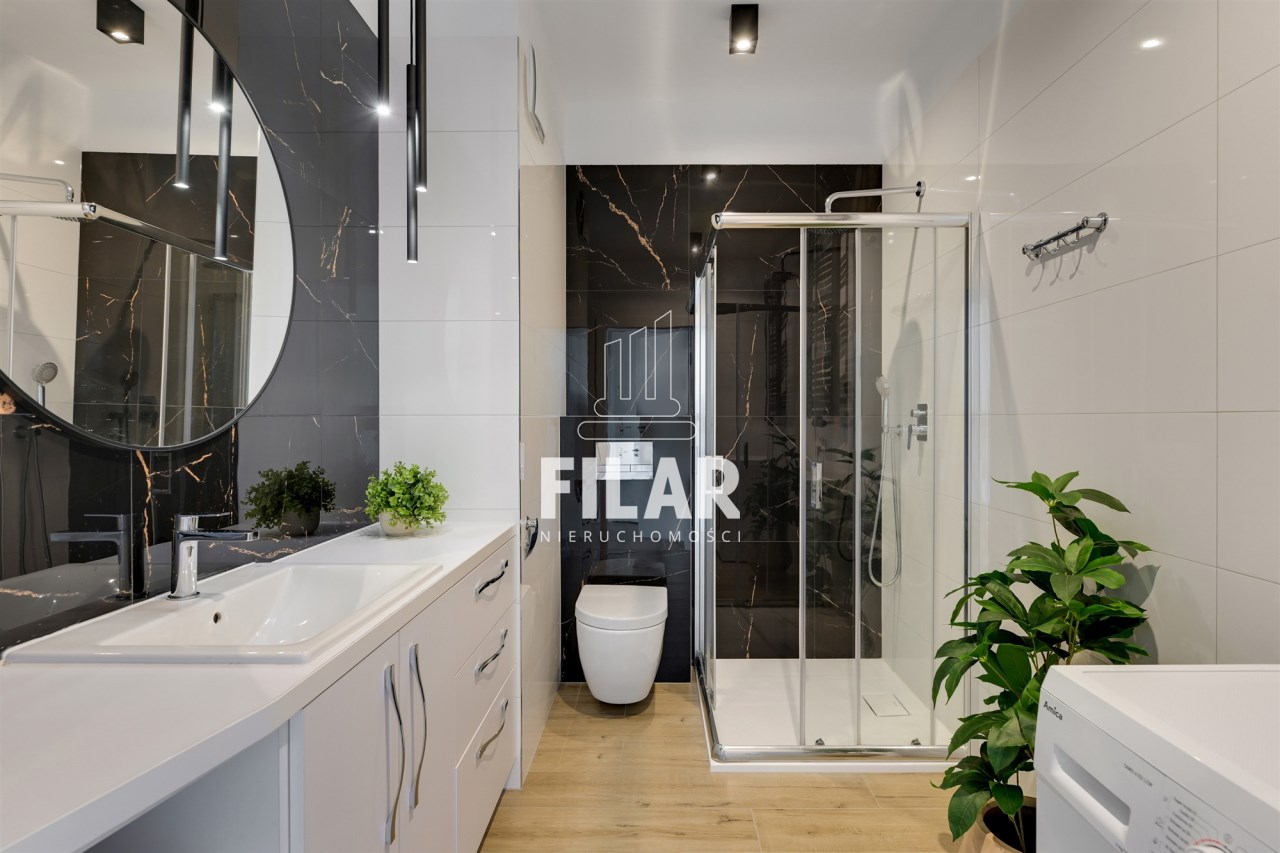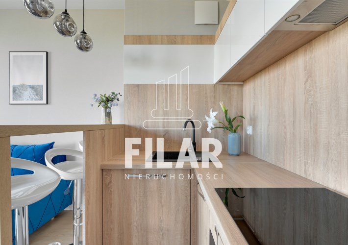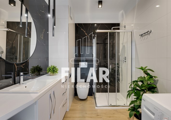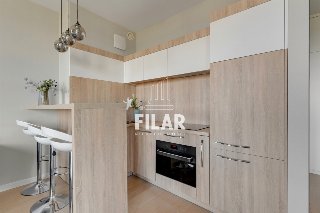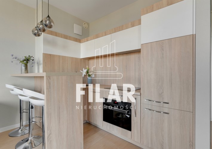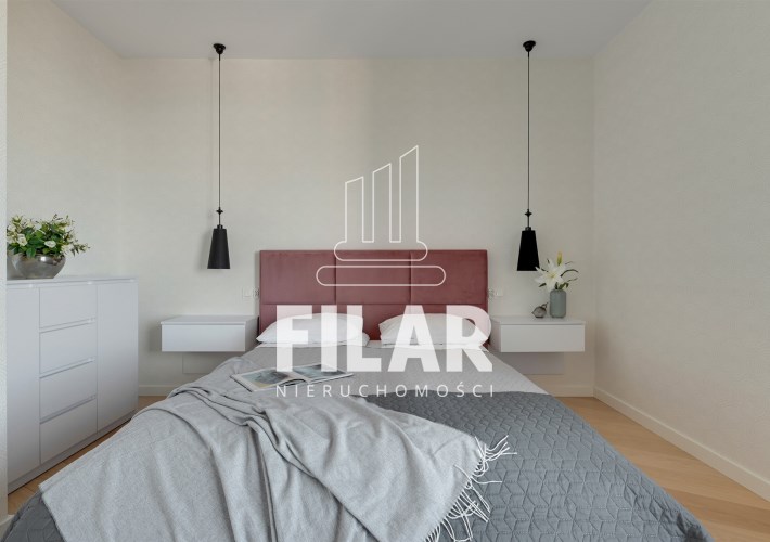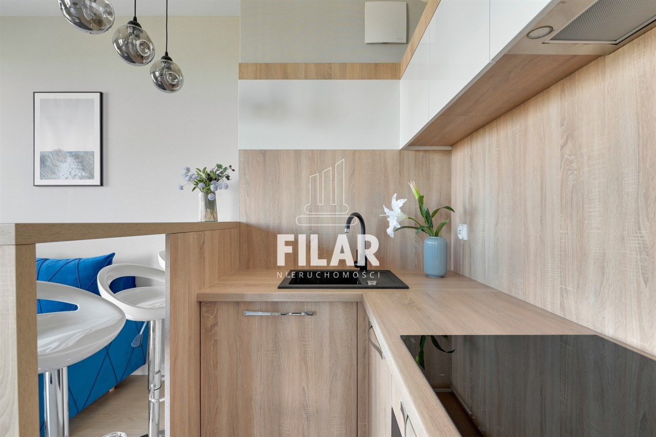 A modern apartment with an area of 41 m2, located on the 10th floor of a newly built building. The apartment consists of a spacious living room with a kitchenette, a bedroom, a bathroom and a hall. In a clearly separated relaxation area there is a comfortable corner sofa and a coffee table, on the opposite side there is a media wall with a TV and a TV cabinet. Thanks to large-format windows, the living room windows offer a beautiful view of the sea and the city panorama, there is a direct exit to a large terrace, from which you can also admire the charms of the sea landscape. A kitchen area with a built-in kitchenette and an island, equipped with modern household appliances: fridge-freezer, oven, induction hob, hood, cabinet fronts in wood color with a touch of white. The bedroom has a double bed with a headboard, bedside tables and a chest of drawers. The bright tiles dominating in the bathroom have been broken for contrast with black, the whole looks very stylish, there is a shower, toilet, sink and washing machine. The entire apartment has been decorated according to the prevailing trends and finished with the highest quality materials with attention to the smallest details.