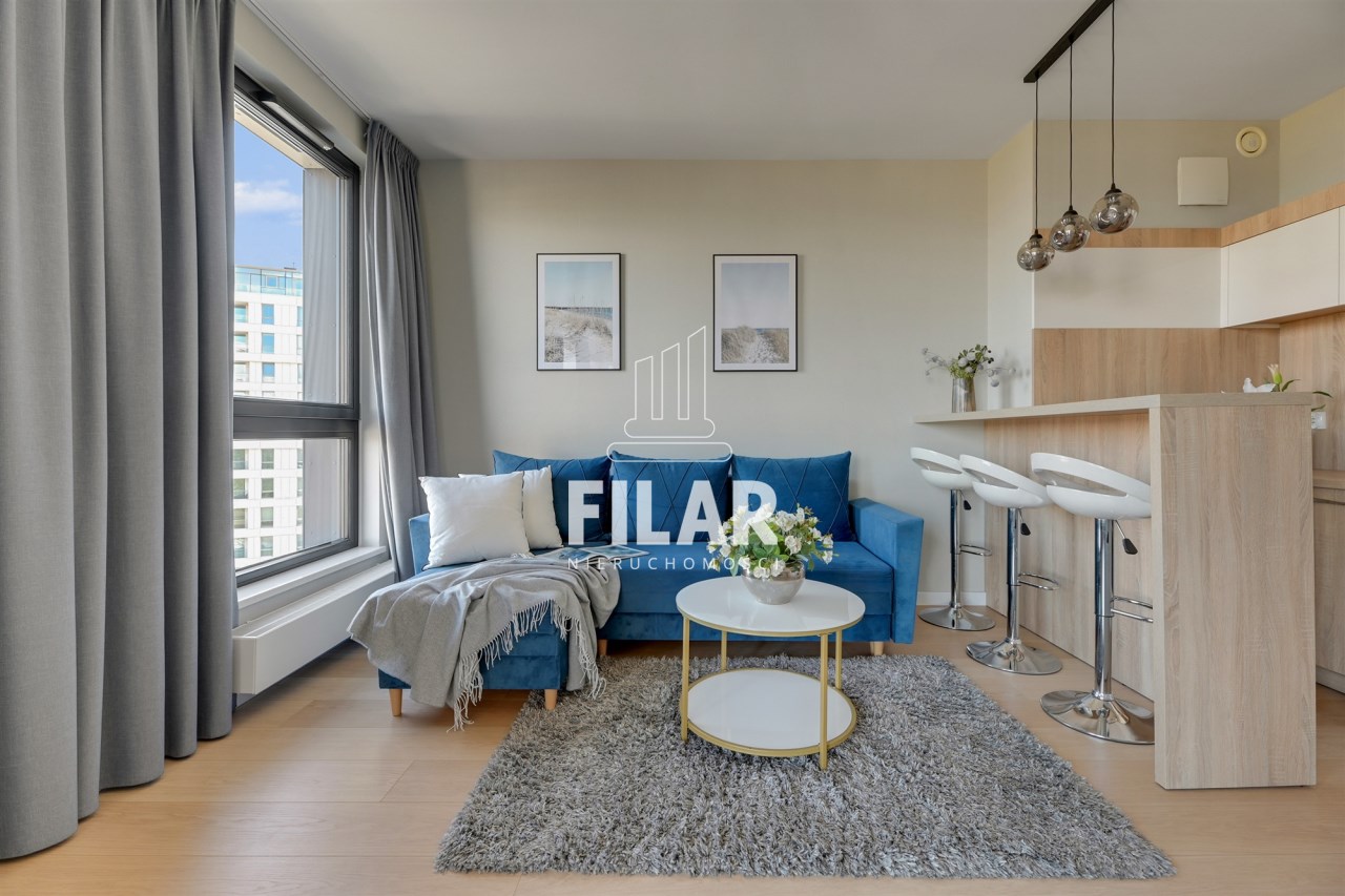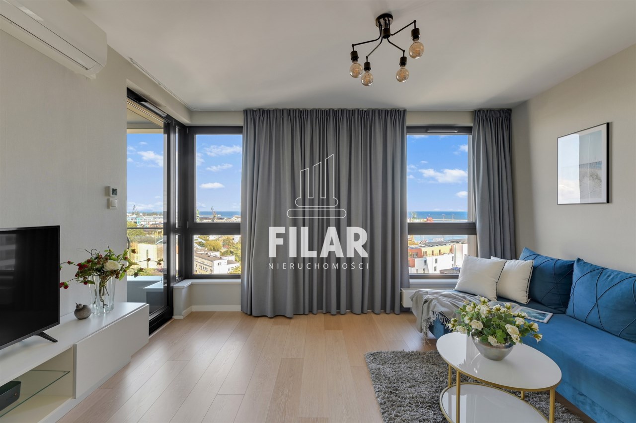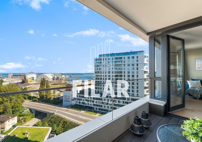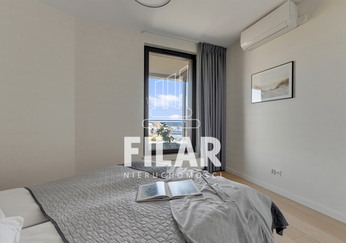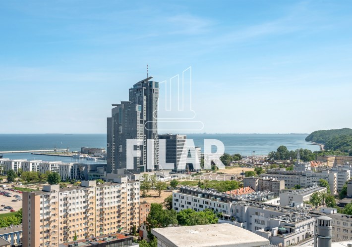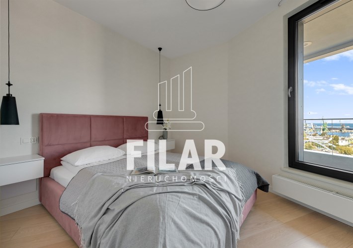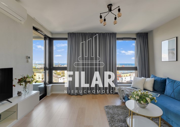 Nowoczesny apartament o powierzchni 41m2usytuowany na 12 piętrze nowoczesnego budynku. Mieszkanie składa się z przestronnego salonu połączonego z aneksem kuchennym, sypialni oraz łazienki i przedpokoju. W wyraźnie wydzielonej strefie wypoczynkowej znajduje się wygodna, narożna sofa i stolik kawowy, po przeciwnej stronie ściana medialna z TV oraz szafka RTV. Dzięki wielkoformatowym witrynom okiennym z okien salonu rozpościera się przepiękny widok na morze oraz panoramę miasta, znajduję się tam bezpośrednie wyjście na duży taras, z którego również można podziwiać uroki morskiego krajobrazu. Część kuchenna z zabudowanym aneksem i wyspą, wyposażona w nowoczesny sprzęt AGD: lodówko-zamrażalka, piekarnik, płyta indukcyjna, okap, fronty szafek w kolorze drewna z domieszką bieli. W sypialni dwuosobowe łóżko małżeńskie z wezgłowiem, szafki nocne oraz komoda. Dominujące w łazience jasne kafle przełamane zostały dla kontrastu czarnym, całość prezentuję bardzo się stylowo, znajduję się tam prysznic, WC, umywalka oraz pralka. Cały apartament urządzony został według panujących trendów oraz wykończony materiałami najwyższej jakości z dbałością o najmniejsze detale.