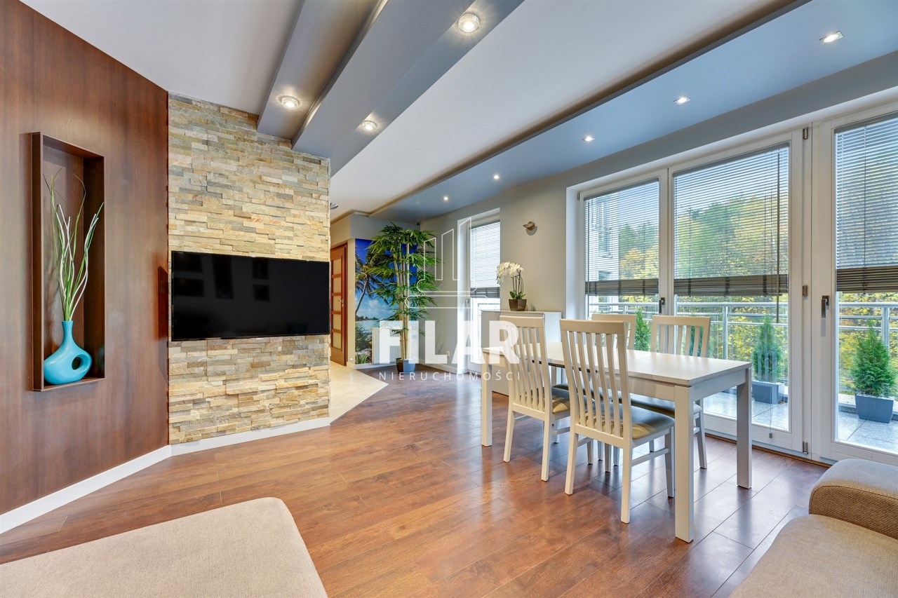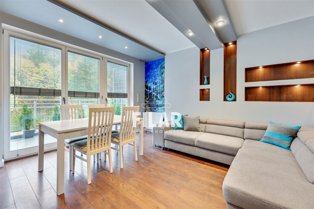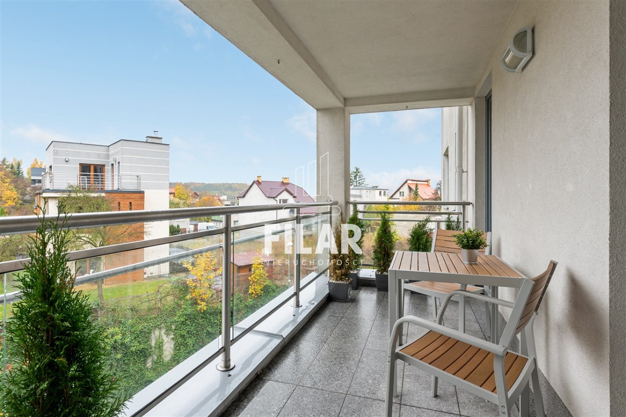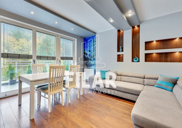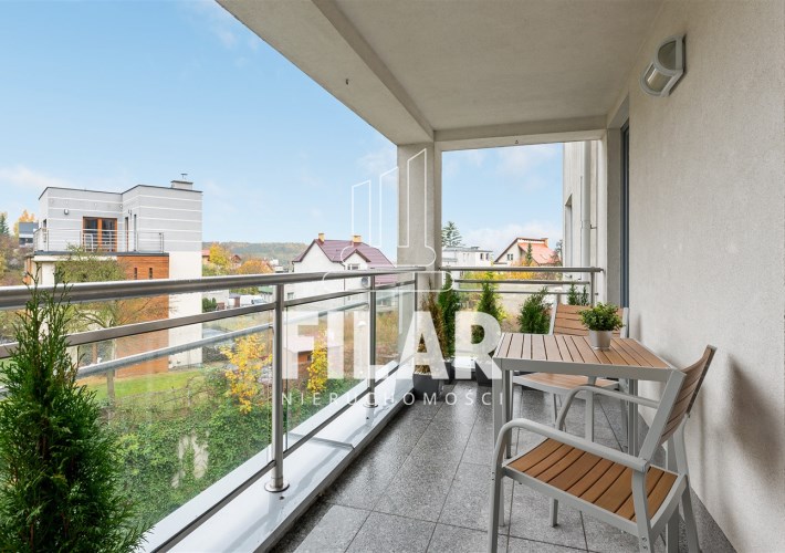 The apartment with an area of approx. 80 m2 consists of a living room, two bedrooms, separate kitchen, bathroom and two spacious balconies. Large bathroom with tub and shower. All rooms are fully furnished and equipped. The apartment is distinguished by its peace and quiet, which create a very intimate atmosphere. The price includes a parking space in the garage and a large basement with a window.