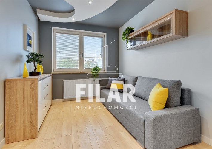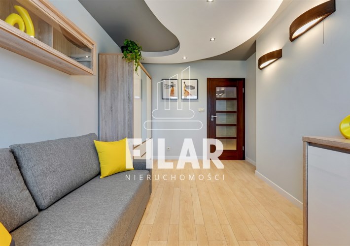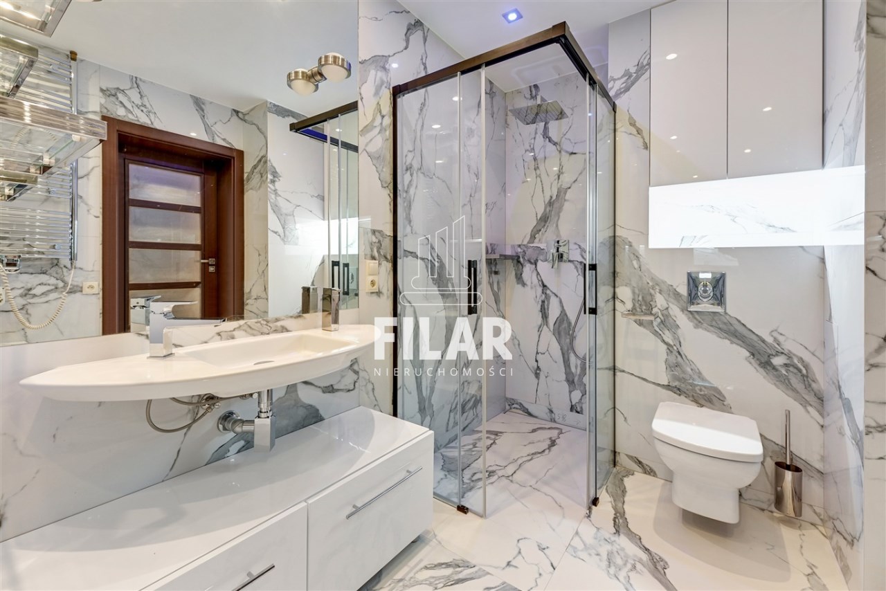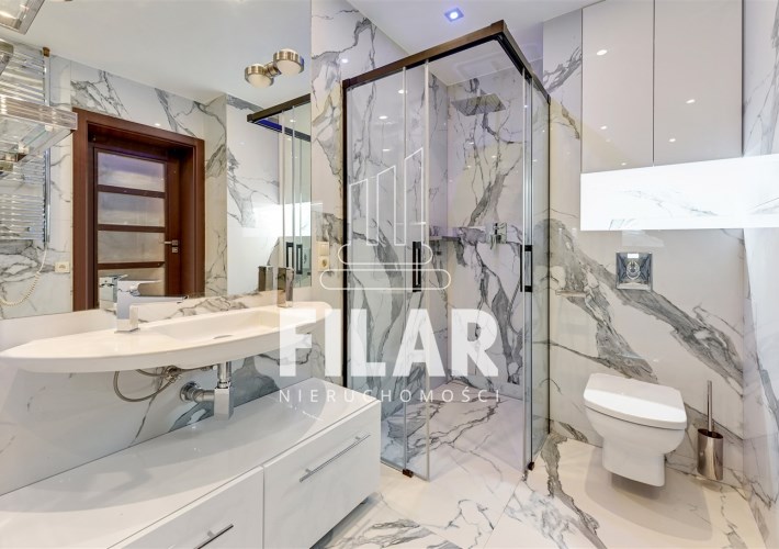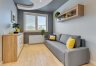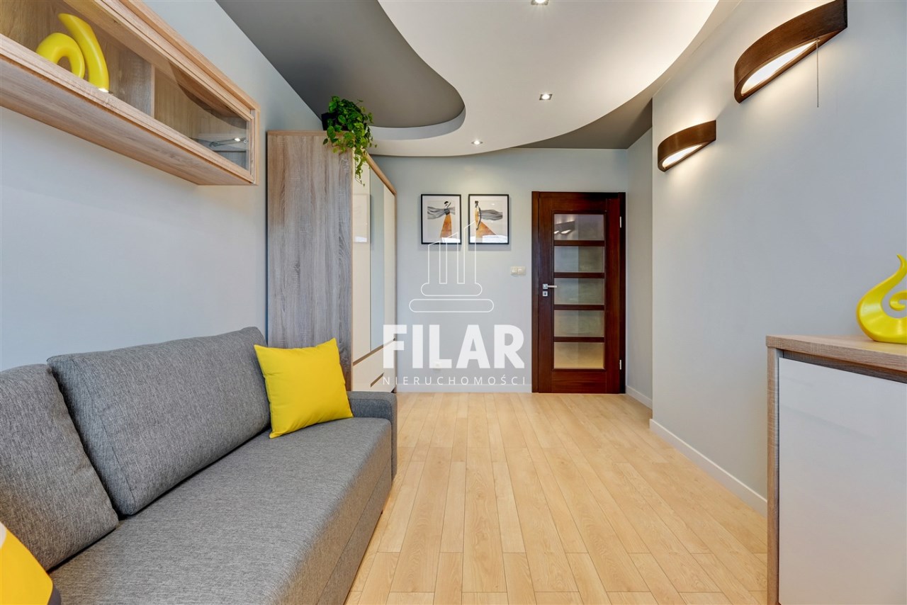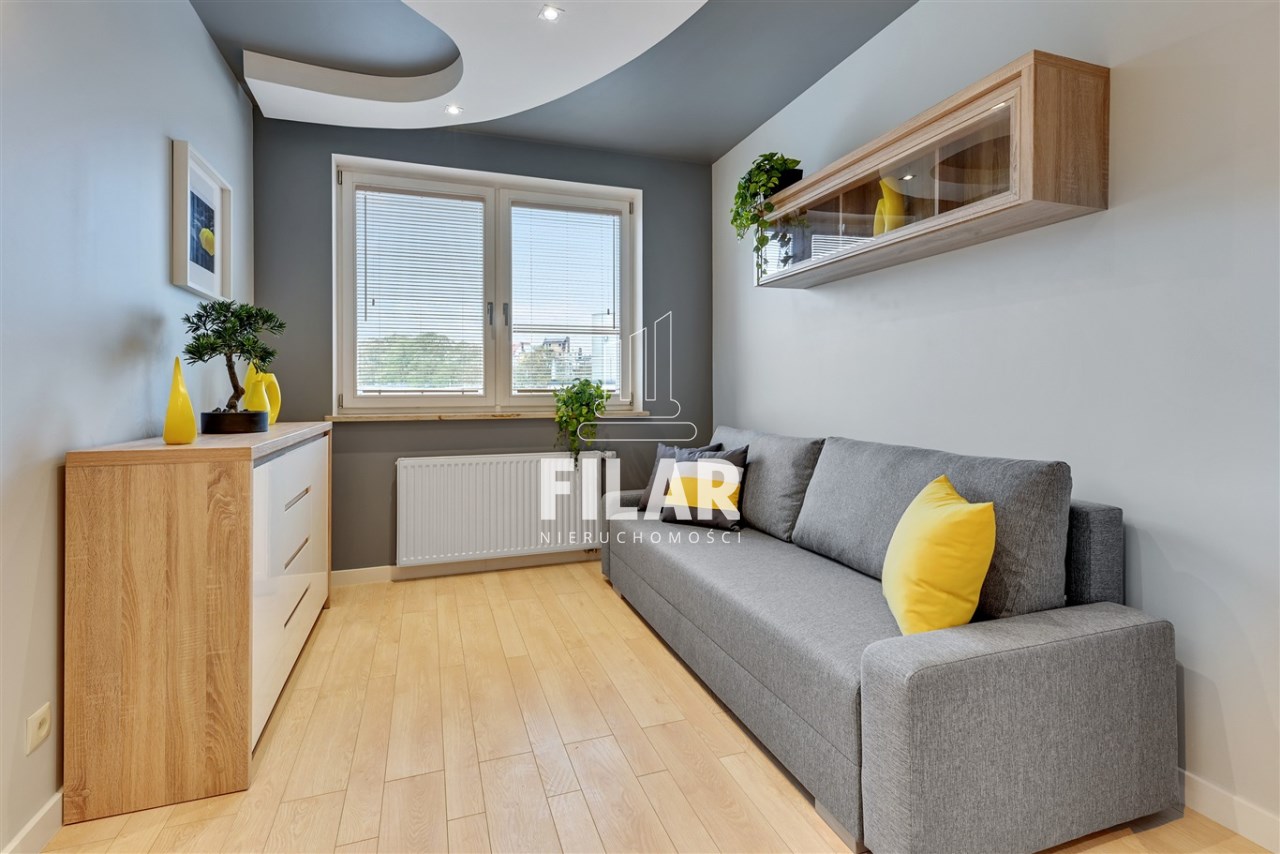Apartament o powierzchni ok. 80 m2 składa się z salonu, dwóch sypialni, oddzielnej kuchni, łazienki oraz dwóch przestronnych balkonów. Lokal jest w pełni umeblowany i wyposażony. Centralnym punktem jest przestrony salon z dużą rogową kanapą na, której wprost znajduje się ściana medialna z TV. Punktowe oświetlenie na suficie tworzy klimatyczny nastrój. Obok duży stół z krzesłami, który wydziela strefę jadalnianą. Zabudowa kuchenna ułożona na kształt litery L, mamy tam piekarnik, lodówę, zmywarkę, mikrofalówkę. Fornirowane oraz białe fronty szafek dodają elegancji i rozjaśniają pomieszczenie. W jednej z sypialni duże, dwuosobowe łózko oraz pojemna szafa z lustrzanymi drzwiami, w drugiej rozkładana sofa oraz komoda. Łazienka z wanną i prysznicem, na ścianach i podłodze kafle o strukturze marmuru. W mieszkaniu mamy także oddzielną toaletę.