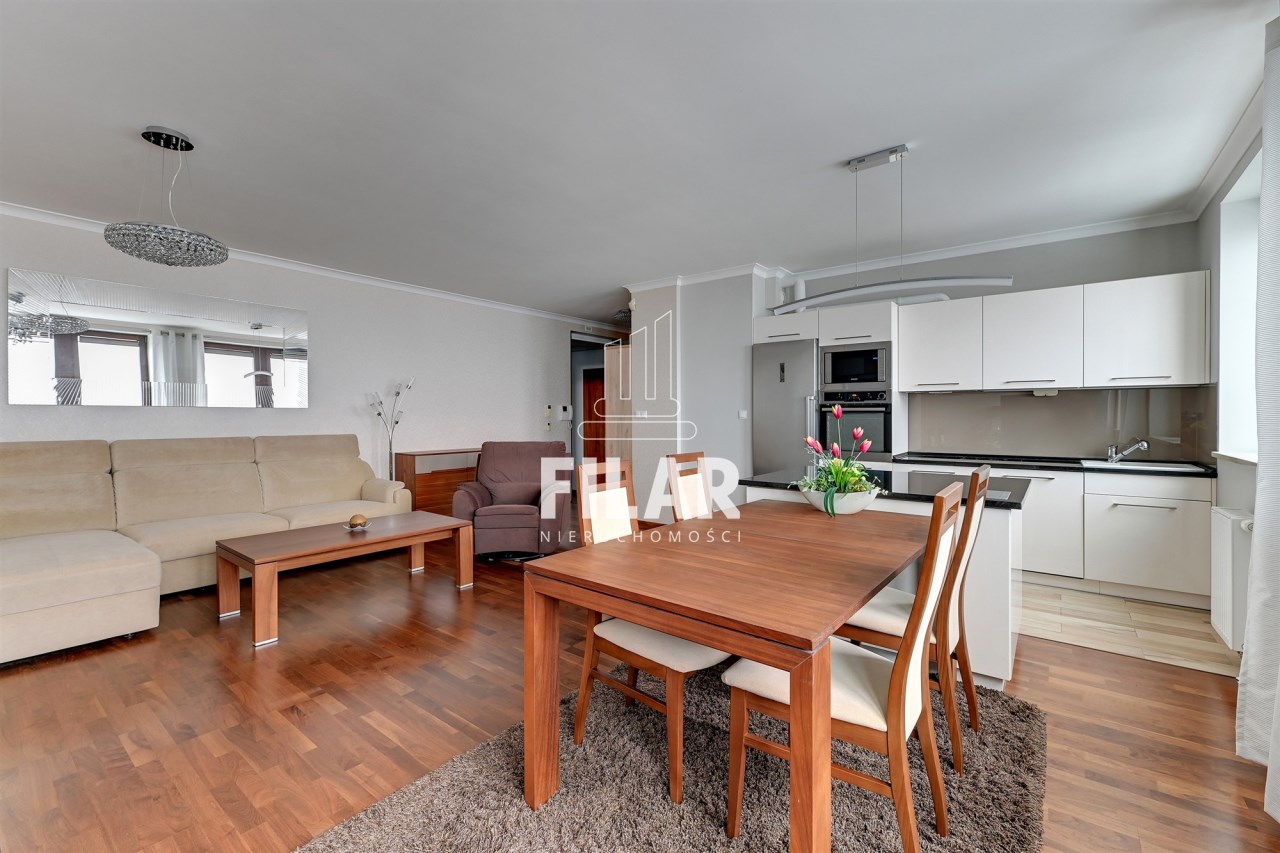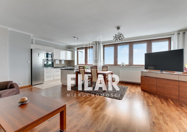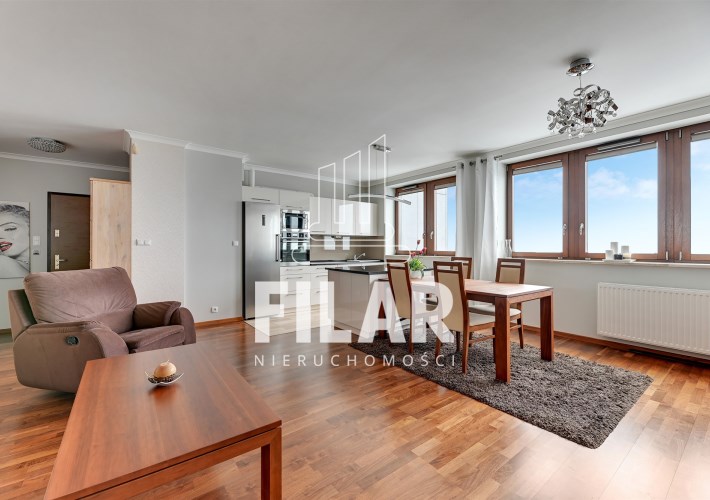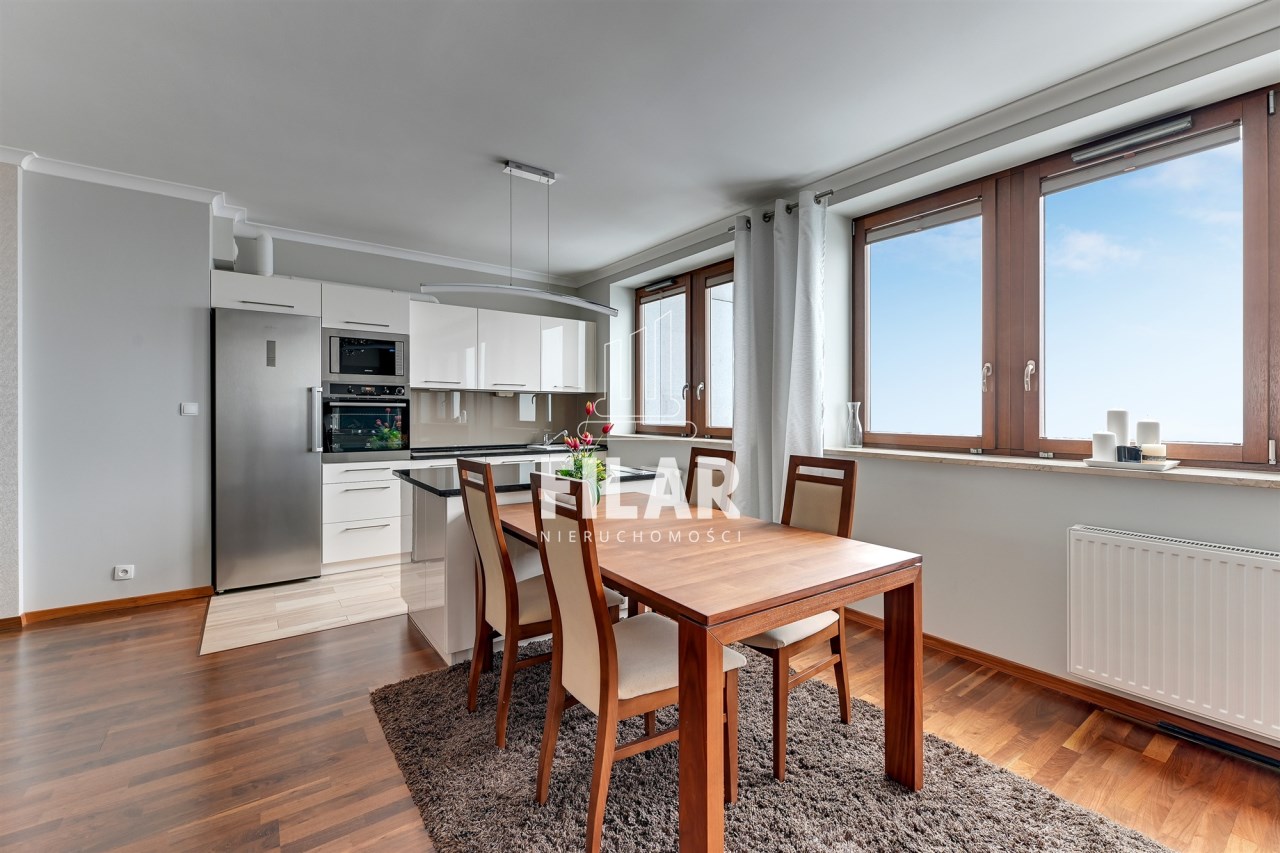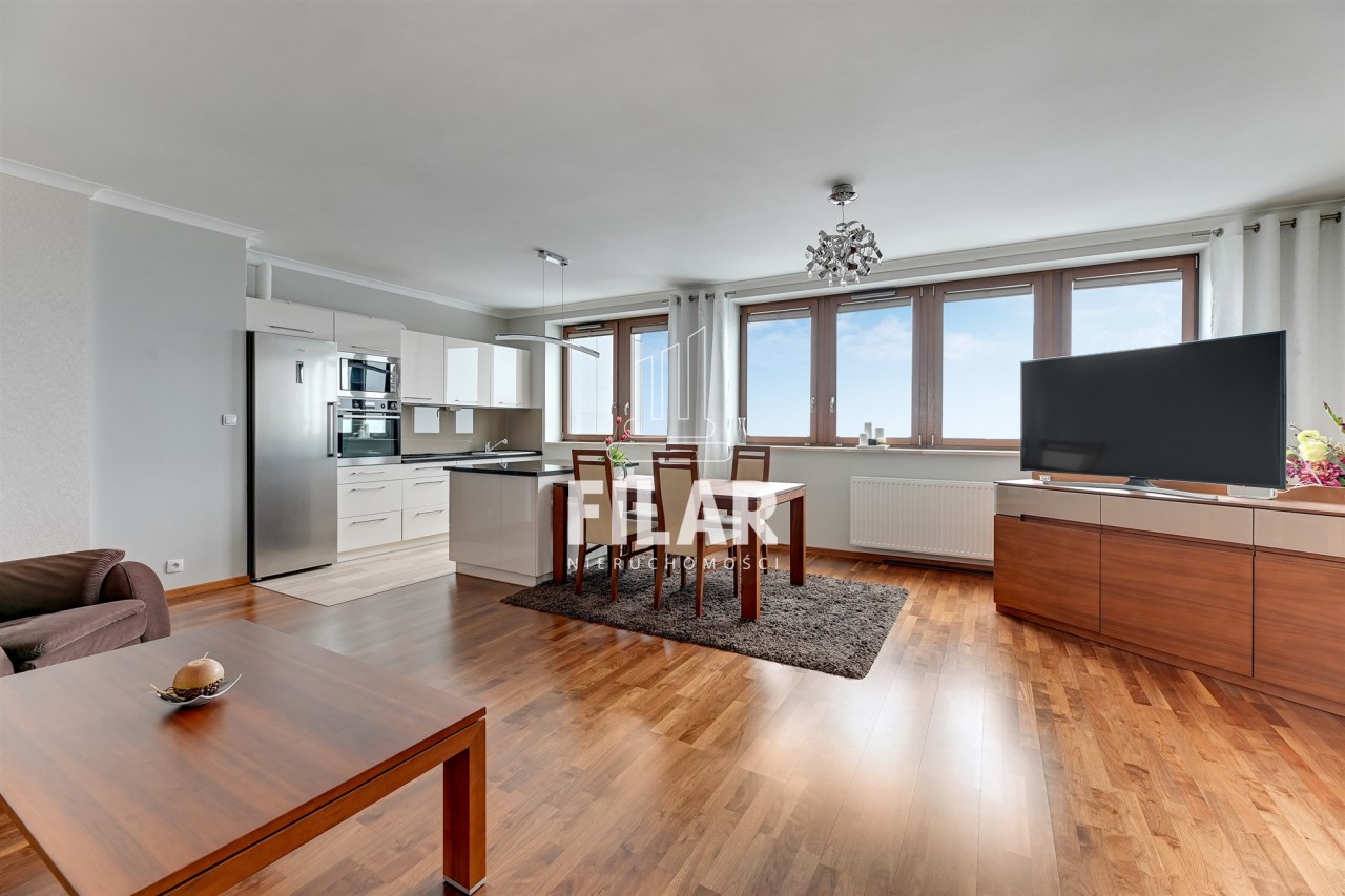 A three-room flat in the Sea Towers building with views of the sea and the city skyline. The flat was designed by an architect with attention to detail. The flat is comfortable, luxurious and at the same time functional. The flat consists of a living room with a kitchenette, two bedrooms, two bathrooms, a utility room and a hallway. The living room has a sofa set with a corner sofa and armchairs, a separate dining area with a table and 6 chairs. The kitchen annex in white buildings, with an island, has been equipped with all necessary household appliances. The smaller bedroom/office has been furnished with a wardrobe wardrobe, a bed, a desk and a chair. From the larger bedroom with a large bed and dressing table, you can directly access one of the bathrooms with a large shower cubicle. In addition to the classic fittings, there is also a bidet. The second bathroom has a bathtub. A space in the garage hall belongs to the flat.