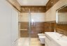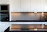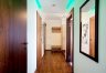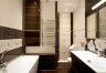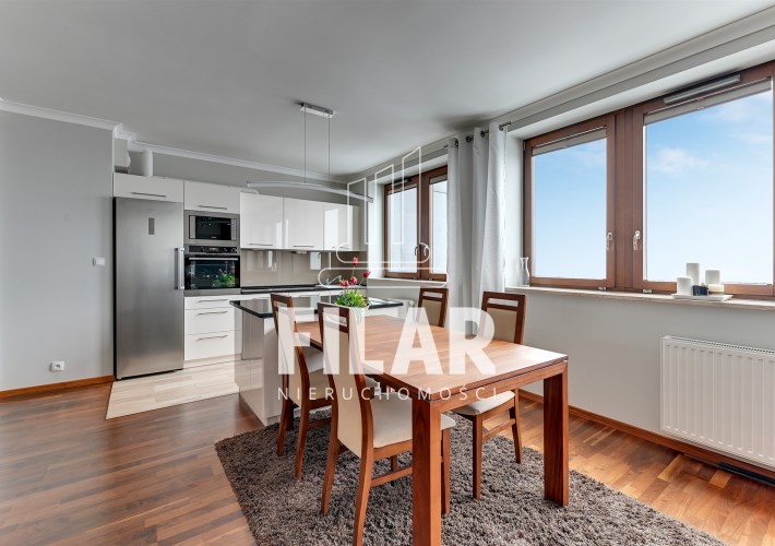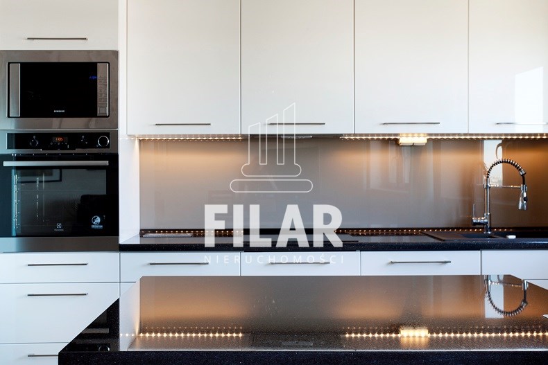 Aneks kuchenny w białej zabudowie, z wyspą, wyposażony został we wszystkie potrzebne sprzęty AGD. Mniejsza z sypialni/gabinet wyposażona została w szafę garderobianą, łóżko, biurko oraz krzesło. Z większej sypialni z dużym łożem oraz toaletką można bezpośrednio przejść do jednej z łazienek z dużą kabiną prysznicową. W wyposażeniu poza klasyczną armaturą znajduje się także bidet. W drugiej łazience znajduje się wanna. Do apartamentu przynależy miejsce w hali garażowej.