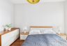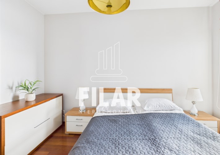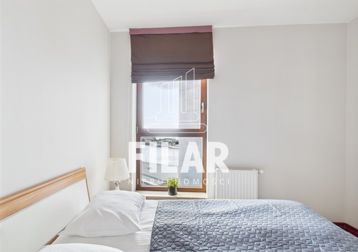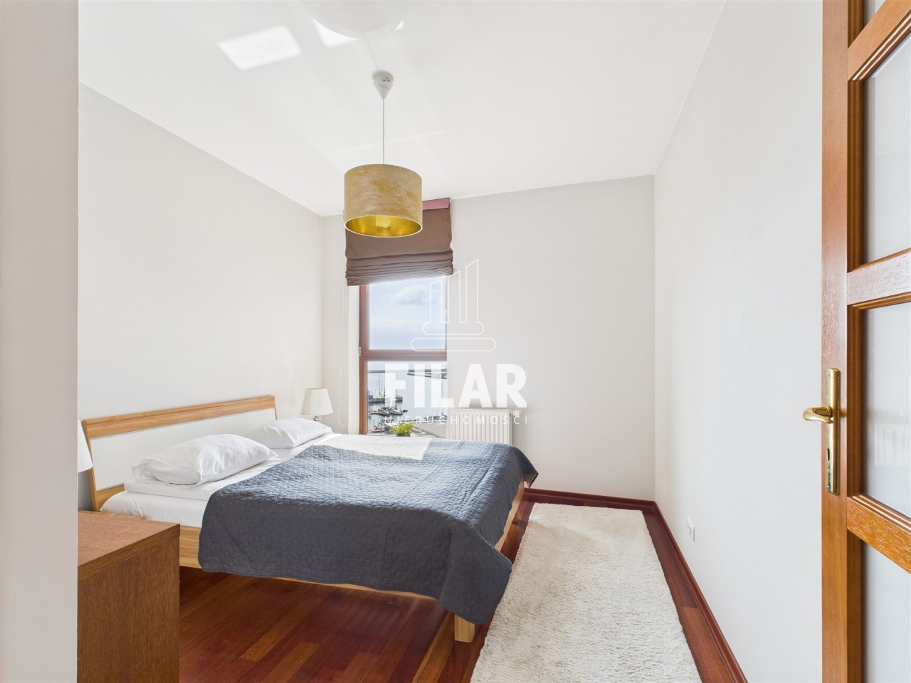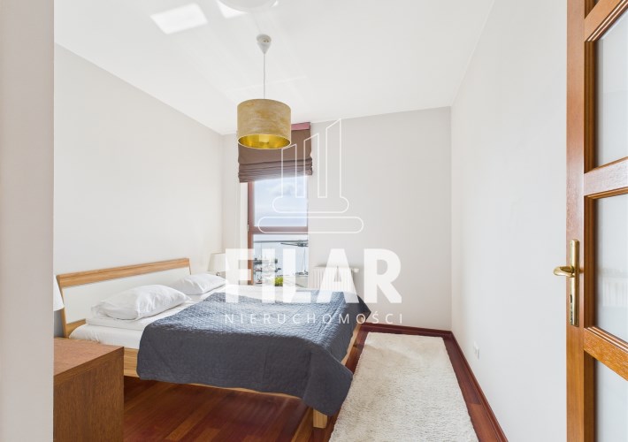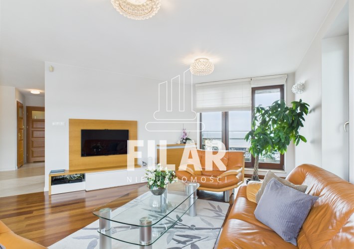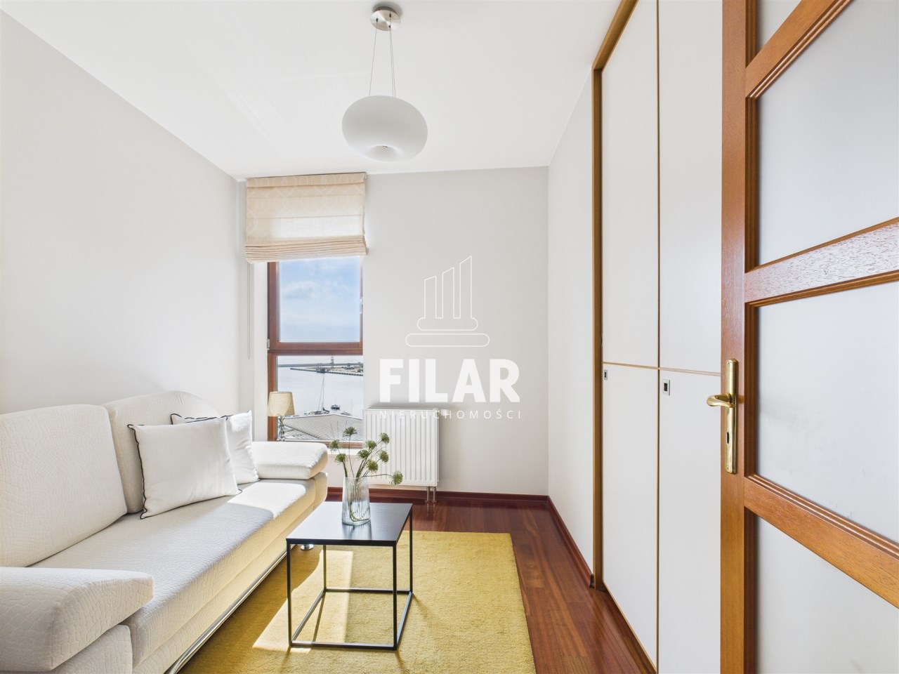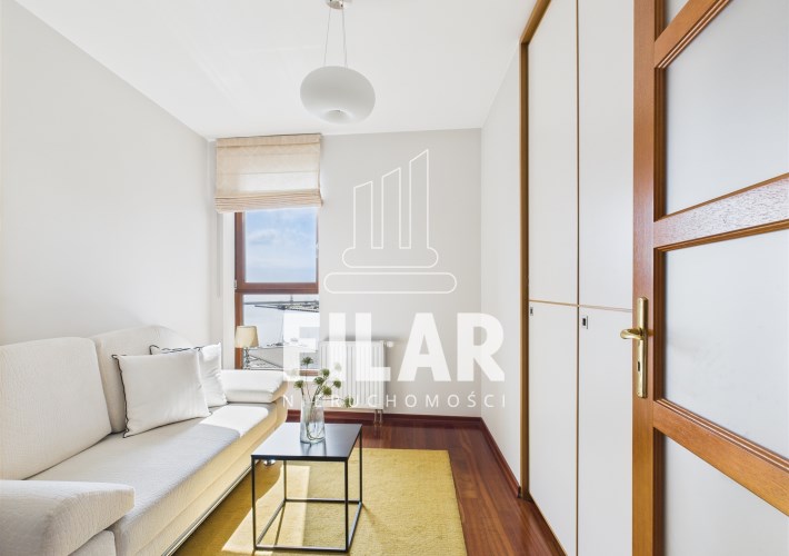 The flat is located on the 6th floor (10 storeys) of the Sea Towers building, and its area of 77 m2 consists of a living room with a separate kitchenette, two rooms, a bathroom and a separate toilet. The living area of the flat is equipped with two sofas, an armchair and a coffee table. On the media wall there is a large TV and a RTV cabinet. In the kitchen area of the apartment there is a stylish development in shades of white and wood. The living room of the flat has a direct exit to the balcony, which offers a beautiful view of the Bay of Gdańsk and the yacht marina. The panoramic windows on the opposite side face the vibrant Gdynia skyline. The overall arrangement of the flat allows you to enjoy the sun all day long. One of the bedrooms of the flat is equipped with a large bed and capacious built-in wardrobes, in the second bedroom there is a double sofa bed. There are two bathrooms in the flat. One of them has a bathtub, a washbasin with mirror and cabinets with shelves, in the other there is a toilet and a shower. The flat is dominated by a decor in white and light brown colours, giving the rooms a classy and elegant feel.