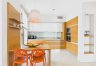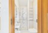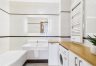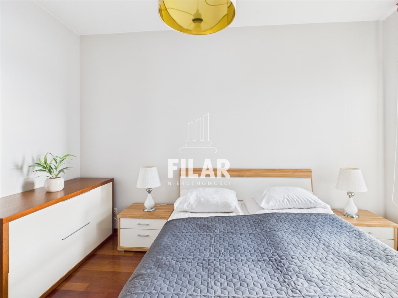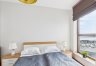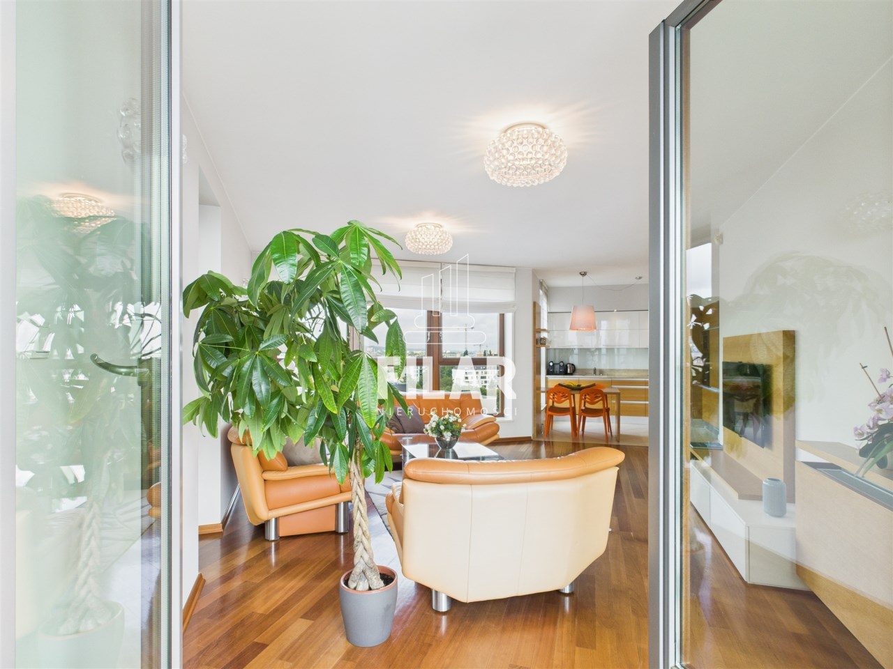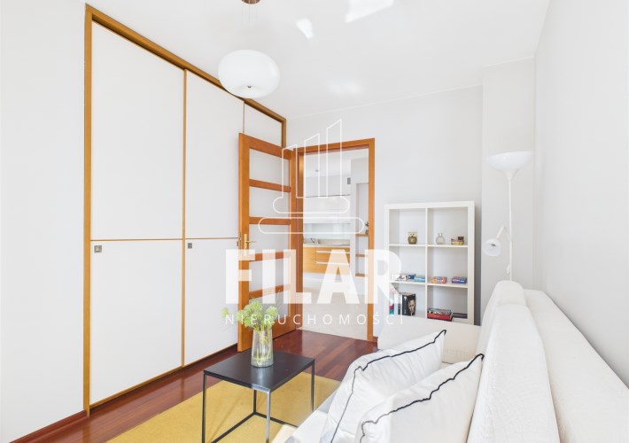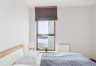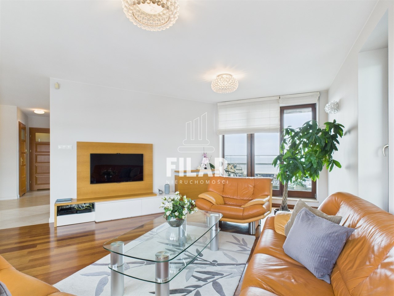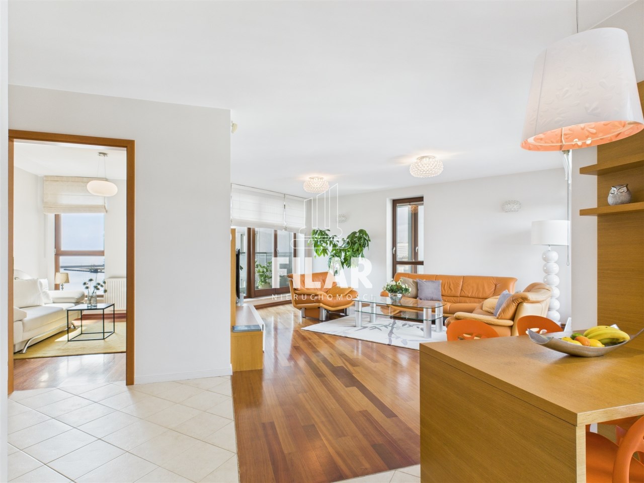 The flat is located on the 6th floor (10 storeys) of the Sea Towers building, and its area of 77 m2 consists of a living room with a separate kitchenette, two rooms, a bathroom and a separate toilet. The living area of the flat is equipped with two sofas, an armchair and a coffee table. On the media wall there is a large TV and a RTV cabinet. In the kitchen area of the apartment there is a stylish development in shades of white and wood. The living room of the flat has a direct exit to the balcony, which offers a beautiful view of the Bay of Gdańsk and the yacht marina. The panoramic windows on the opposite side face the vibrant Gdynia skyline. The overall arrangement of the flat allows you to enjoy the sun all day long. One of the bedrooms of the flat is equipped with a large bed and capacious built-in wardrobes, in the second bedroom there is a double sofa bed. There are two bathrooms in the flat. One of them has a bathtub, a washbasin with mirror and cabinets with shelves, in the other there is a toilet and a shower. The flat is dominated by a decor in white and light brown colours, giving the rooms a classy and elegant feel.