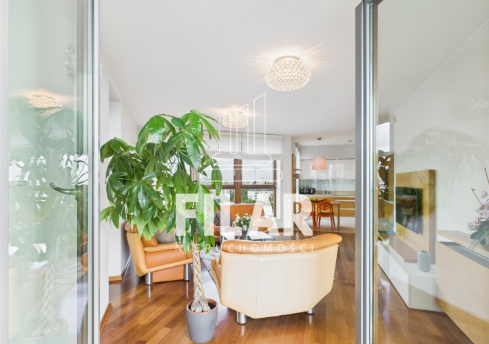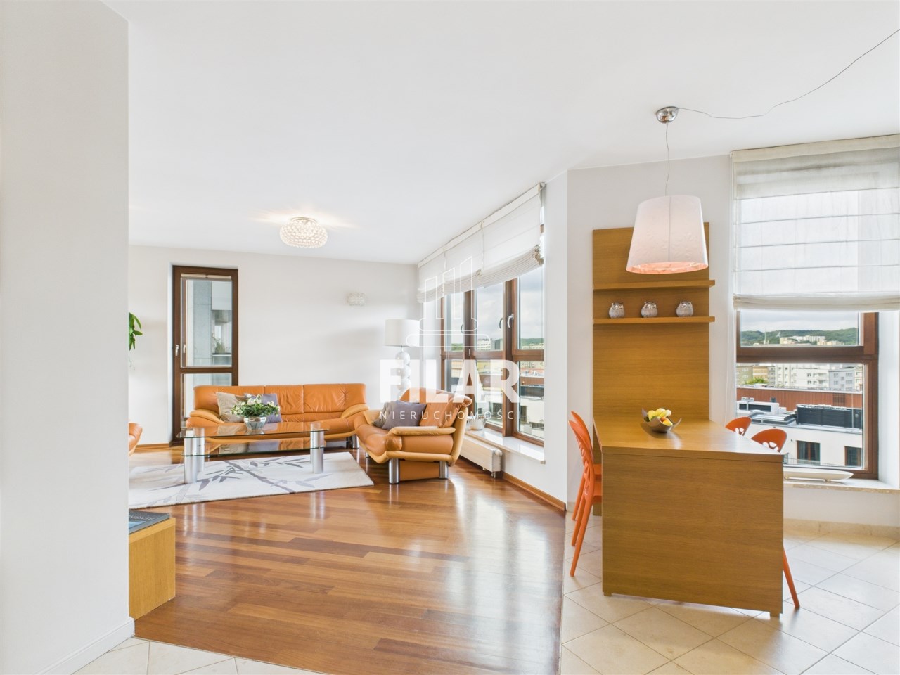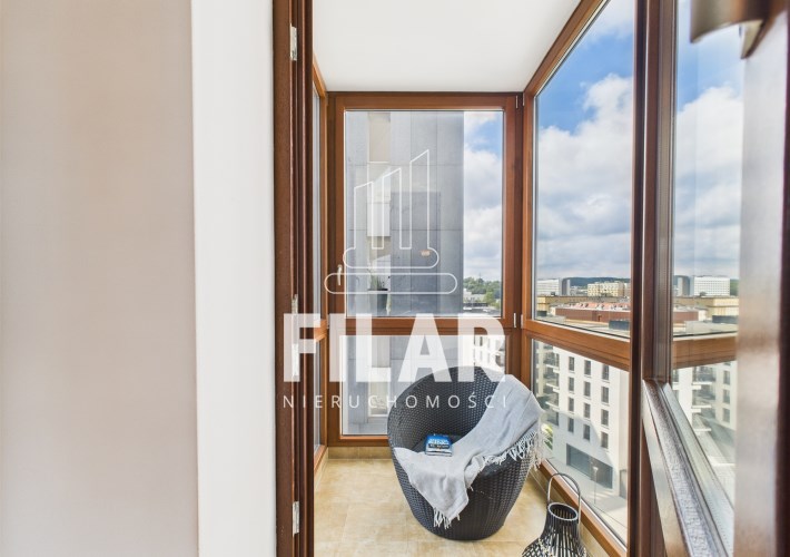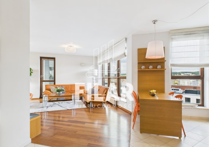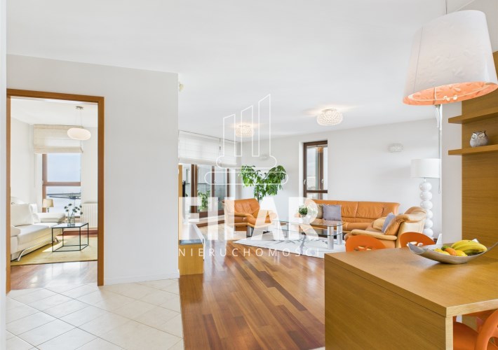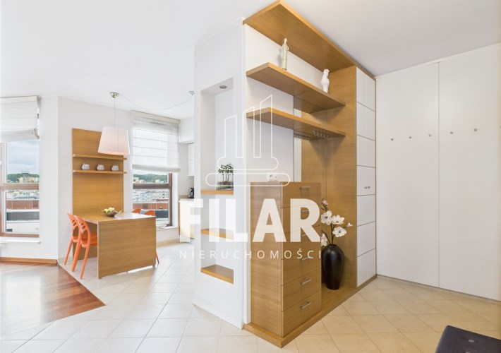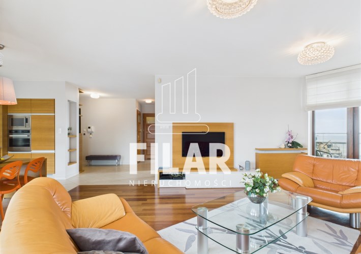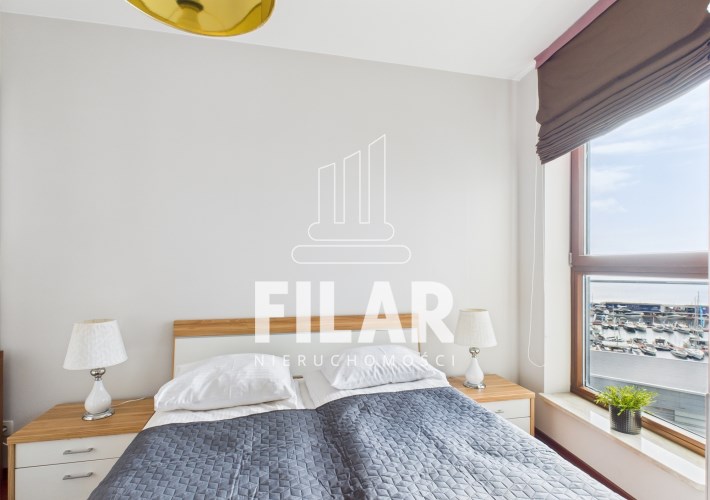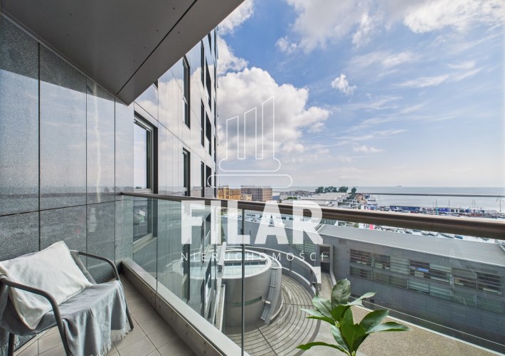 Apartament znajduje się na 6 piętrze (10 kondygnacji) budynku Sea Towers, a na jego powierzchnię 77 m2 składa się salon z wydzielonym aneksem kuchennym, dwa pokoje, łazienka i oddzielna toaleta. Strefa dzienna mieszkania wyposażona została w dwie sofy, fotel oraz stolik kawowy. Na ścianie medialnej duży telewizor oraz szafka RTV. W części kuchennej lokalu stylowa zabudowa w odcieniach bieli i drewna. Z salonu mieszkania mamy bezpośrednie wyjście na balkon, z którego rozpościera się przepiękny widok na Zatokę Gdańską i marinę jachtową. Panoramiczne okna znajdujące się po stronie przeciwnej skierowane są na tętniącą życiem gdyńską panoramę. Całościowe ułożenie apartamentu pozwala rozkoszować się słońcem przez cały dzień. Jedna z sypialni mieszkania wyposażona w duże łóżko oraz pojemne szafy w zabudowie, w drugiej sypialni znajduję się rozkładana, dwuosobowa sofa. W apartamencie mamy dwie łazienki. Jedna z nich posiada wannę, umywalkę z lustrem oraz szafki z pólkami, w drugiej znajduje się toaleta i prysznic. W mieszkaniu dominuje wystrój w barwach bieli i jasnego brązu, nadając pomieszczeniom klasy i elegancji.